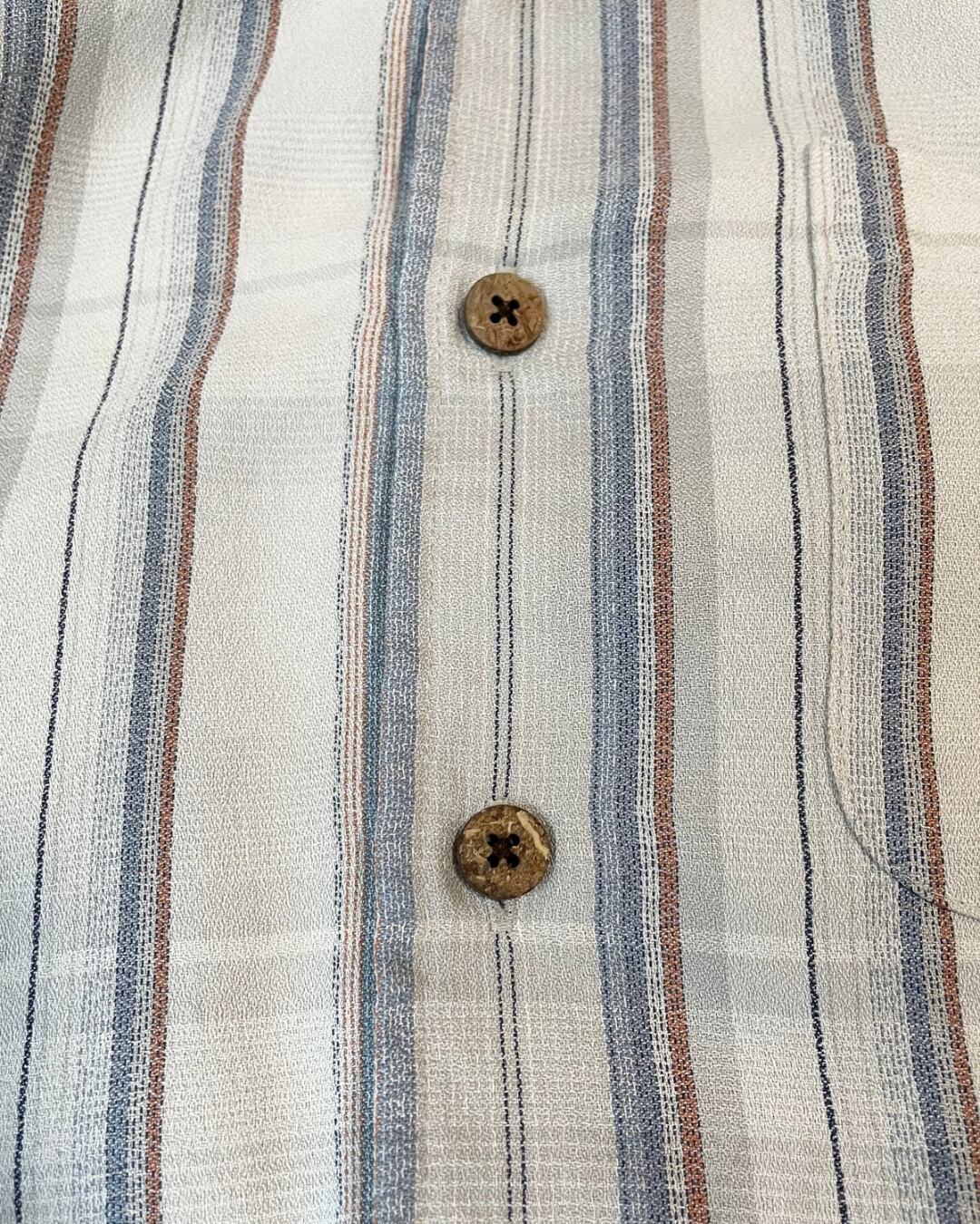清涼感のある素材とウッドボタンの組み合わせがとても夏らしい雰囲気。