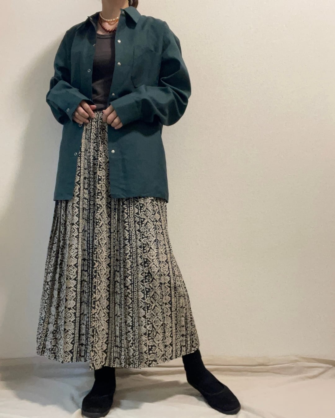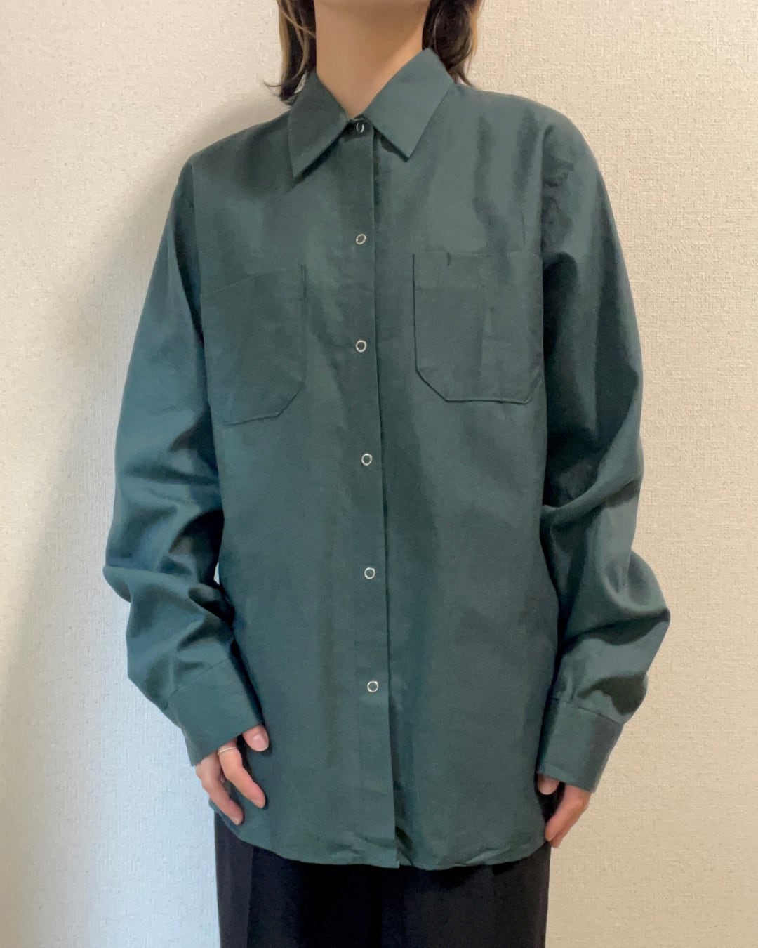 渋めな深緑色がかっこいい雰囲気のワークシャツです。