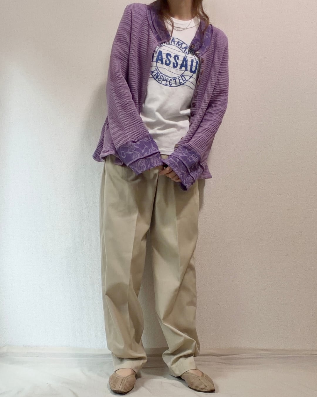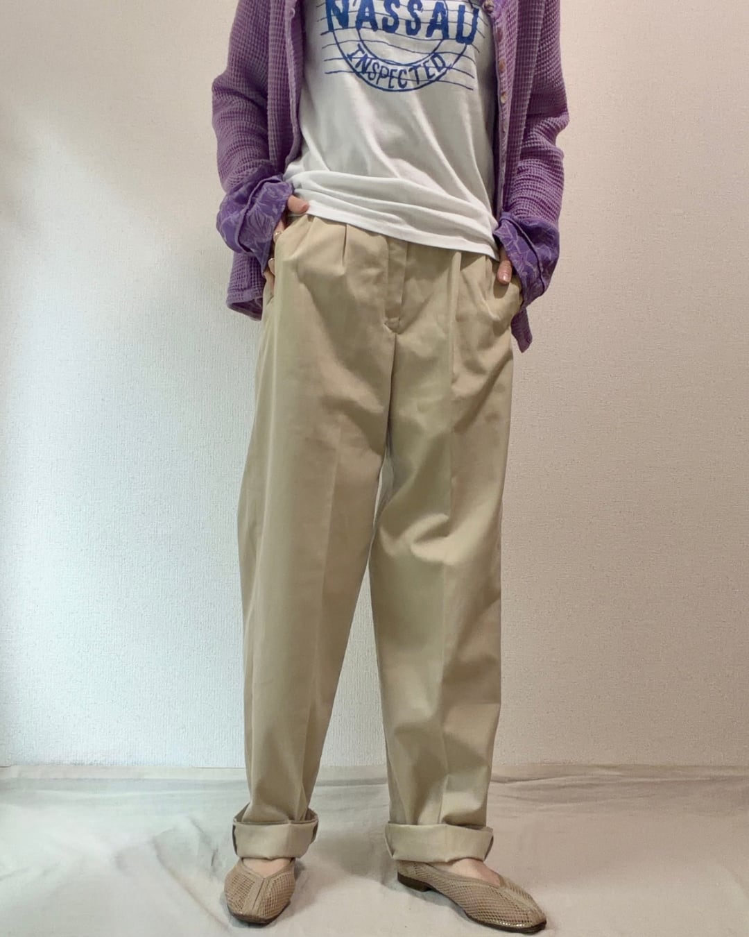 カジュアル、ナチュラル、キレイめ、幅広いスタイルに合わせられるライトベージュ。
