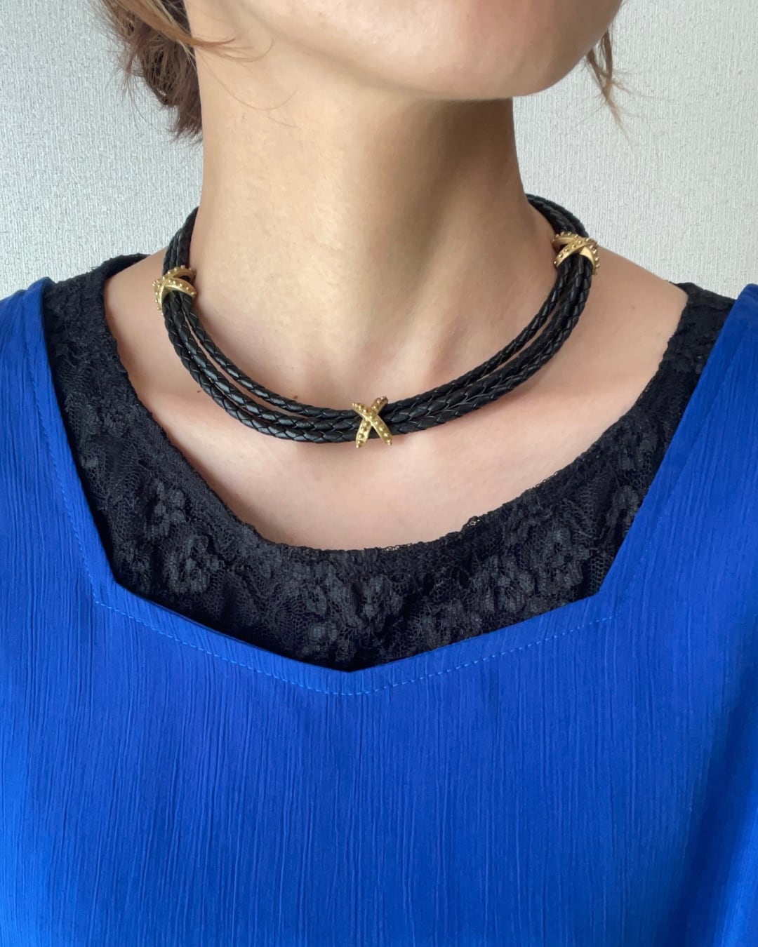 3連のフェイクレザーとゴールドパーツの組み合わせがクールなショートネックレス。