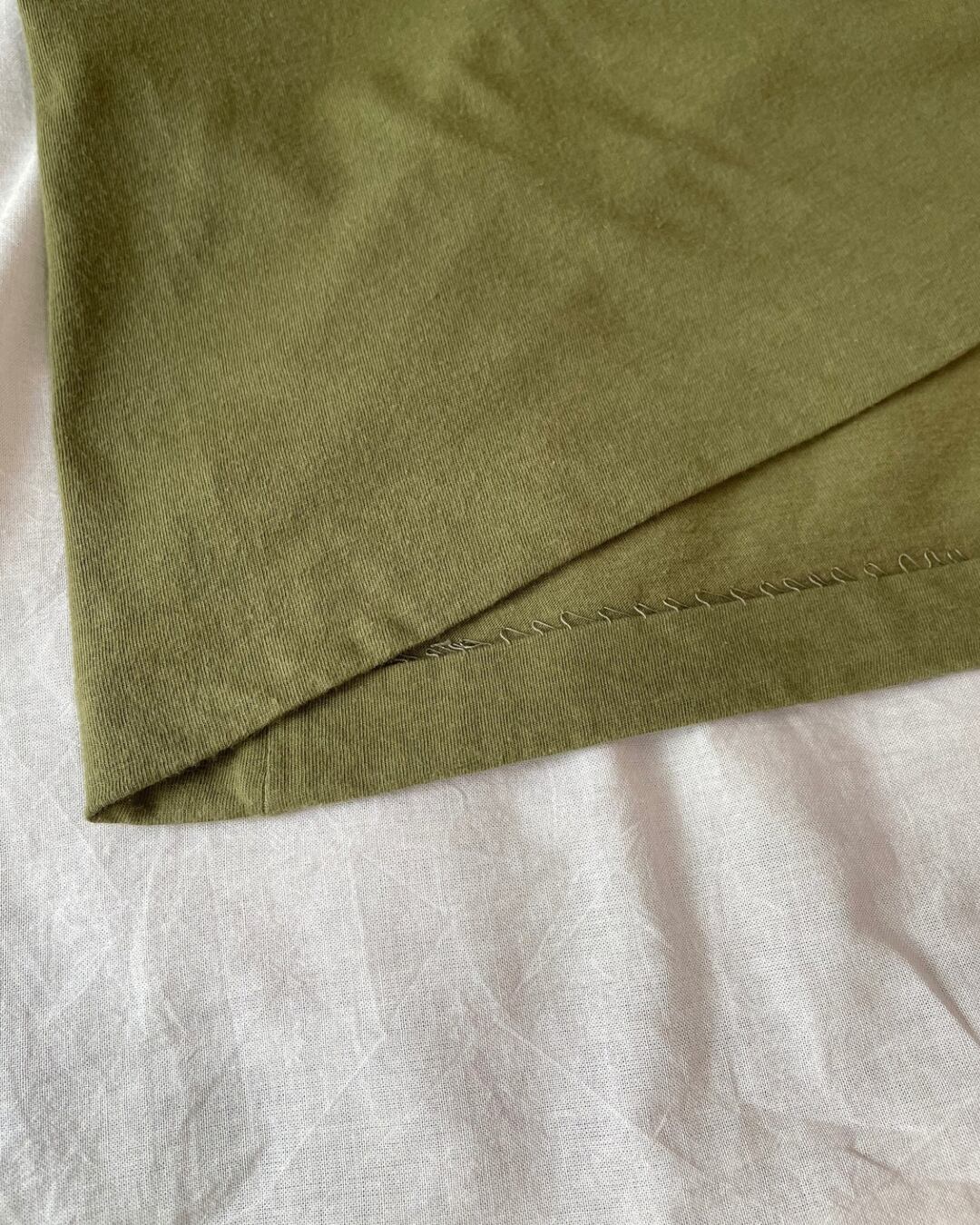柔らかなカーキ色のデザインTシャツ。