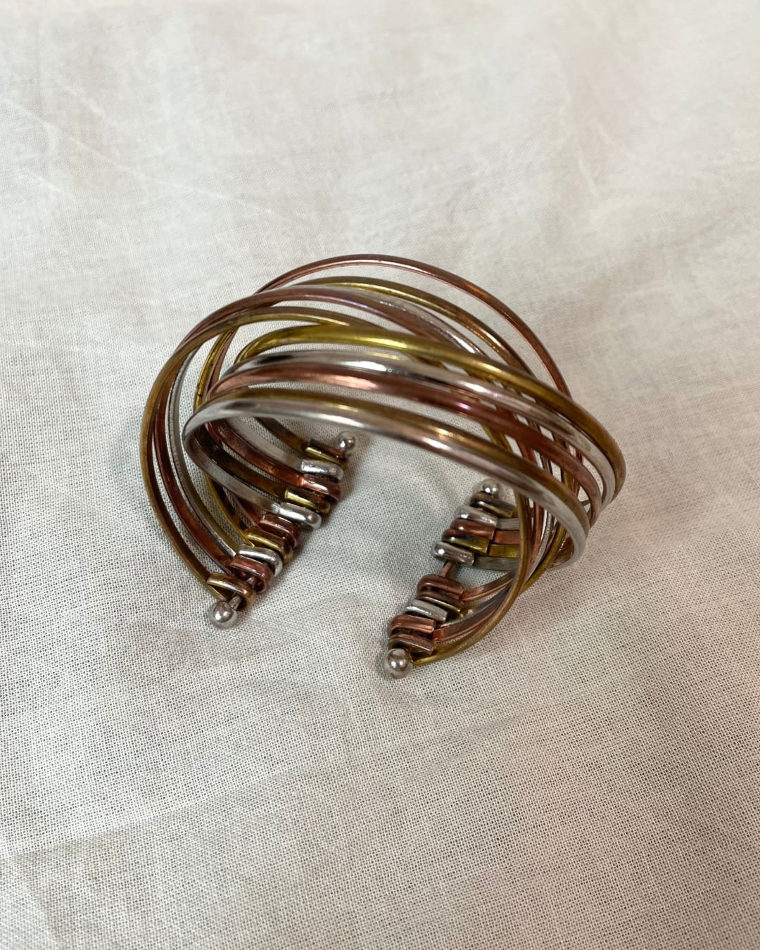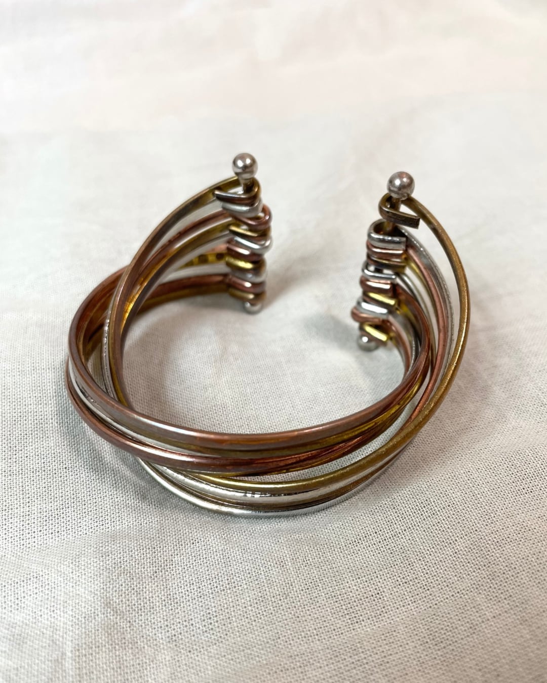 シルバー、ゴールド、ピンクゴールドの3色が連なった存在感あるバングルです。