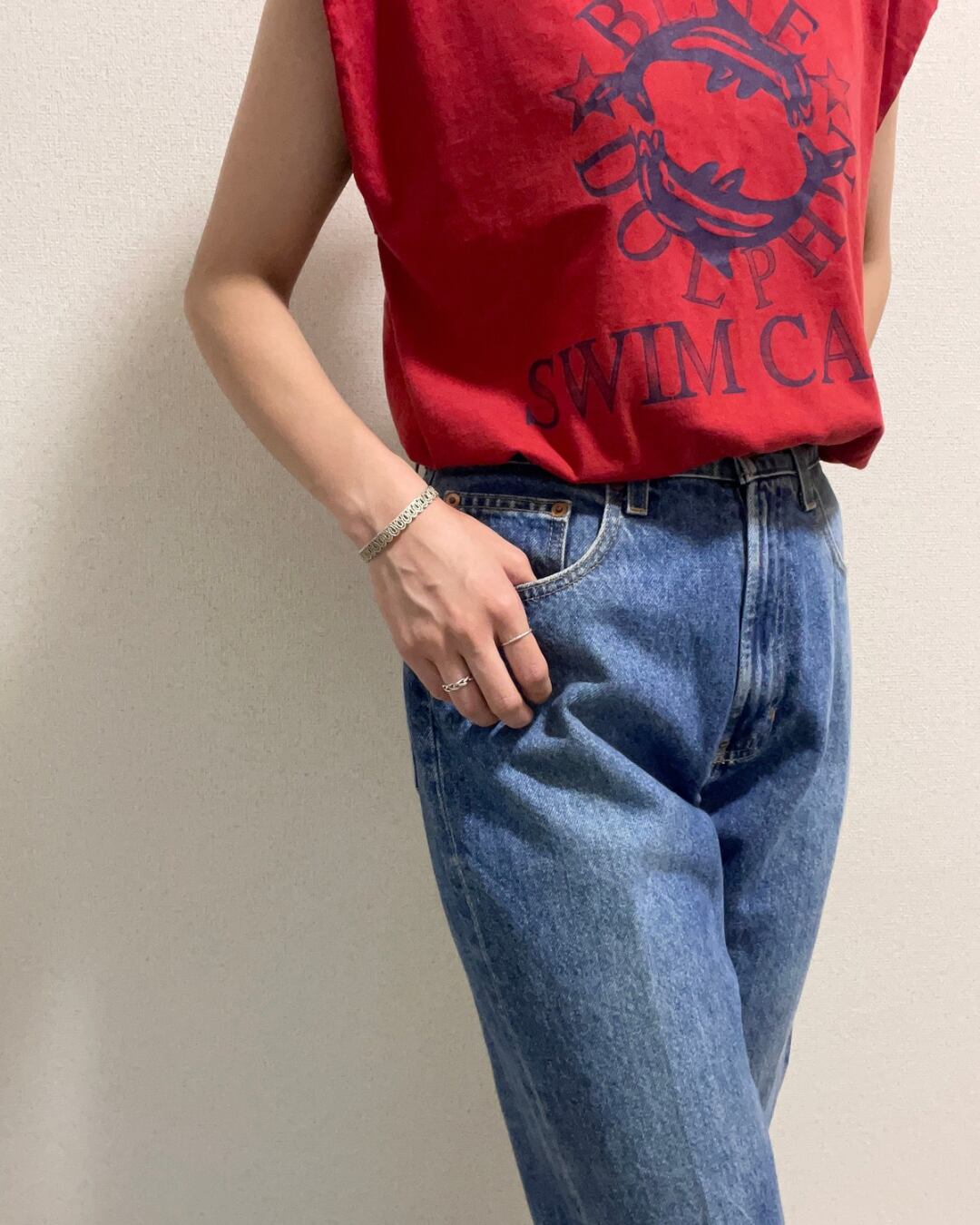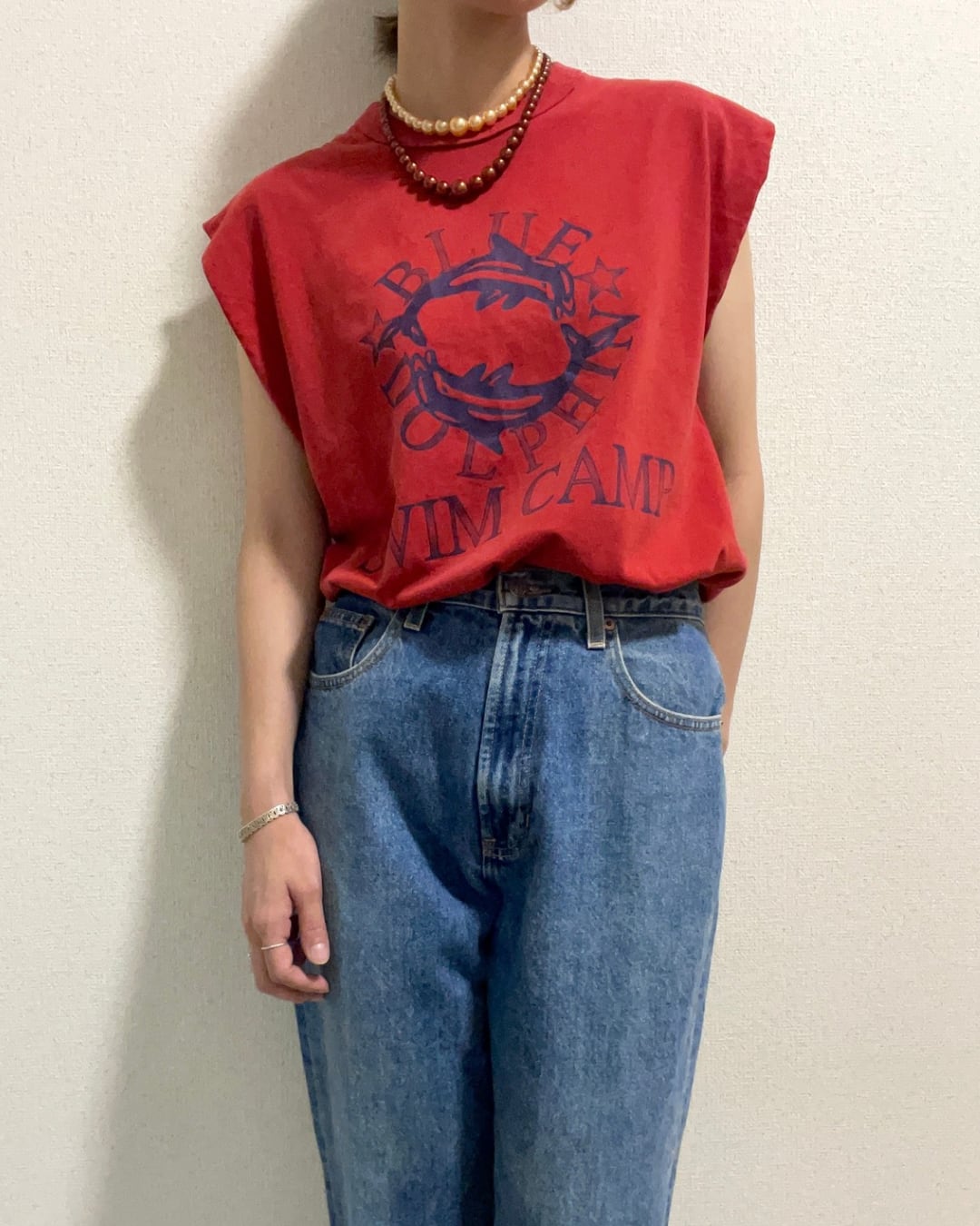 赤いボディにプリントはネイビー。色の雰囲気にどこか渋さがあり、アメカジ系が苦手な方でも意外に大人っぽく着こなしやすいです。