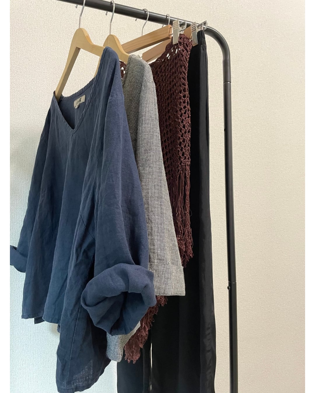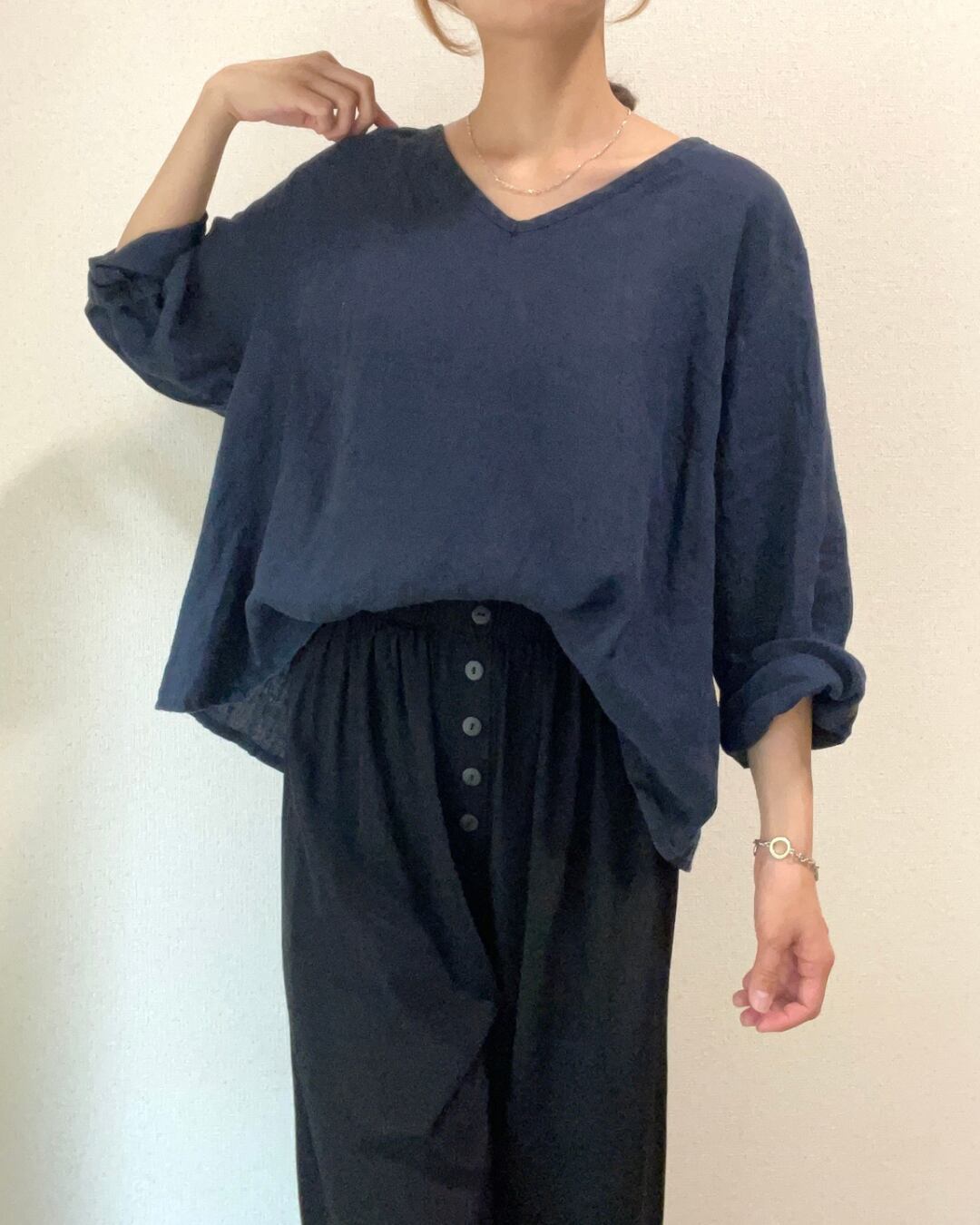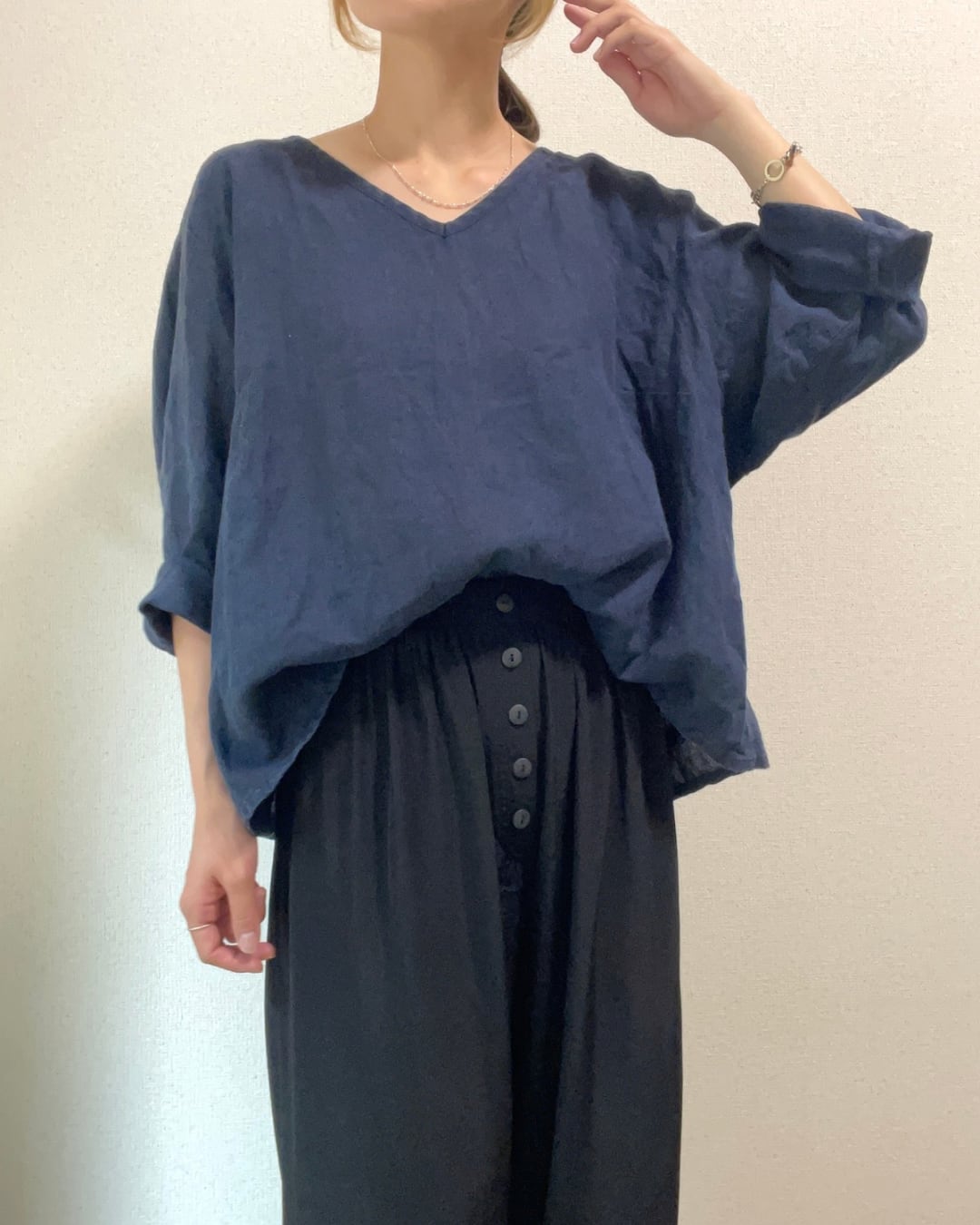 上品な濃紺色のリネンブラウス。