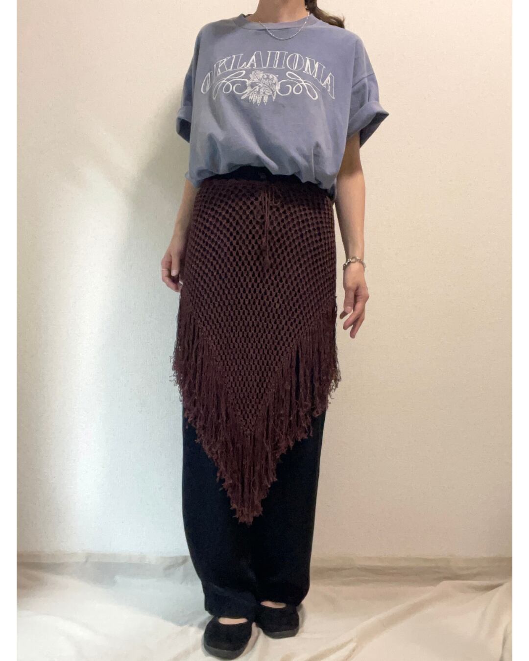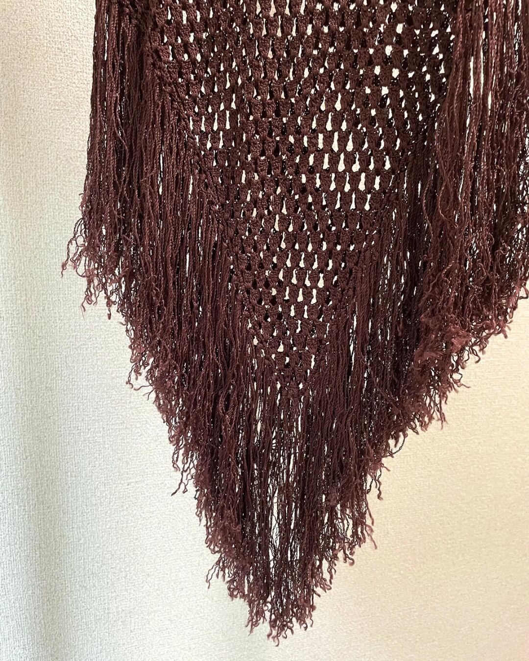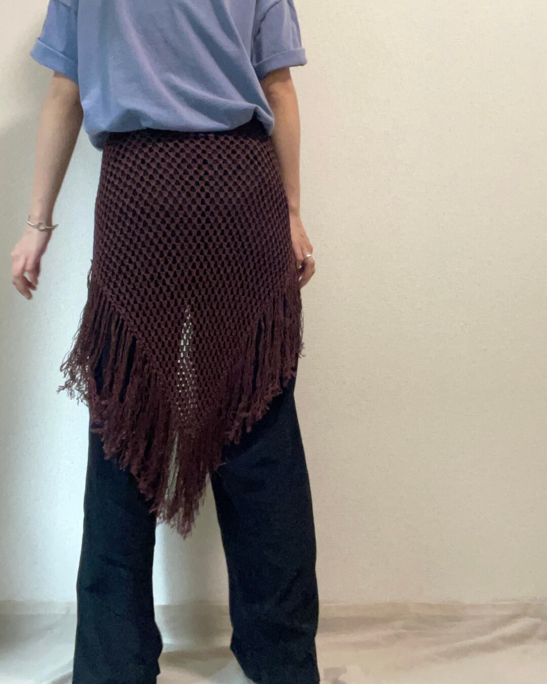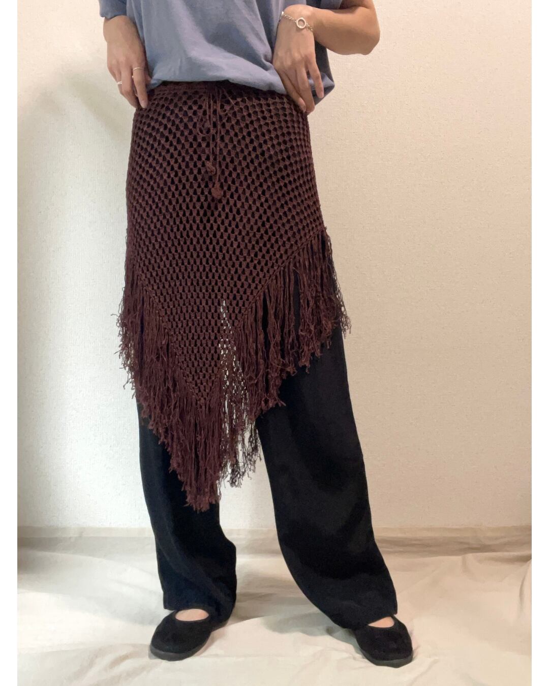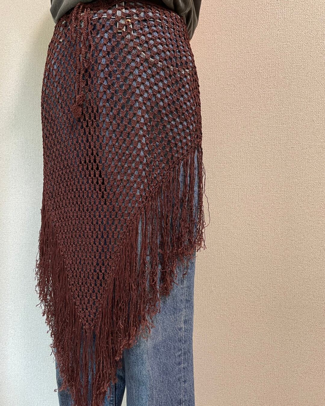 レイヤードを楽しめるメッシュ編みのニットで、裾にはフリンジがたっぷりとついています。