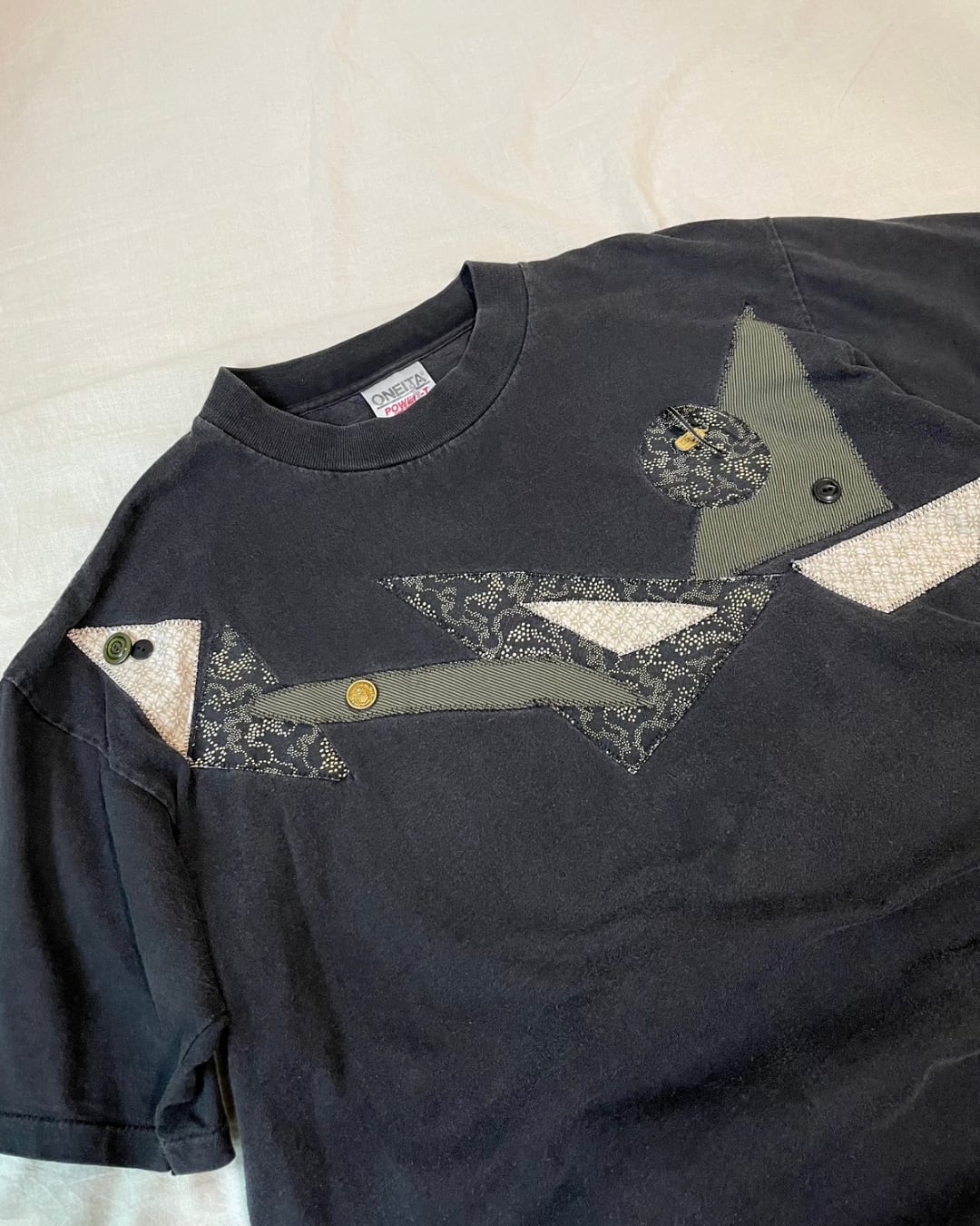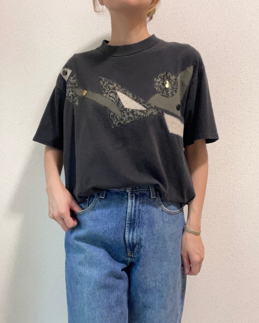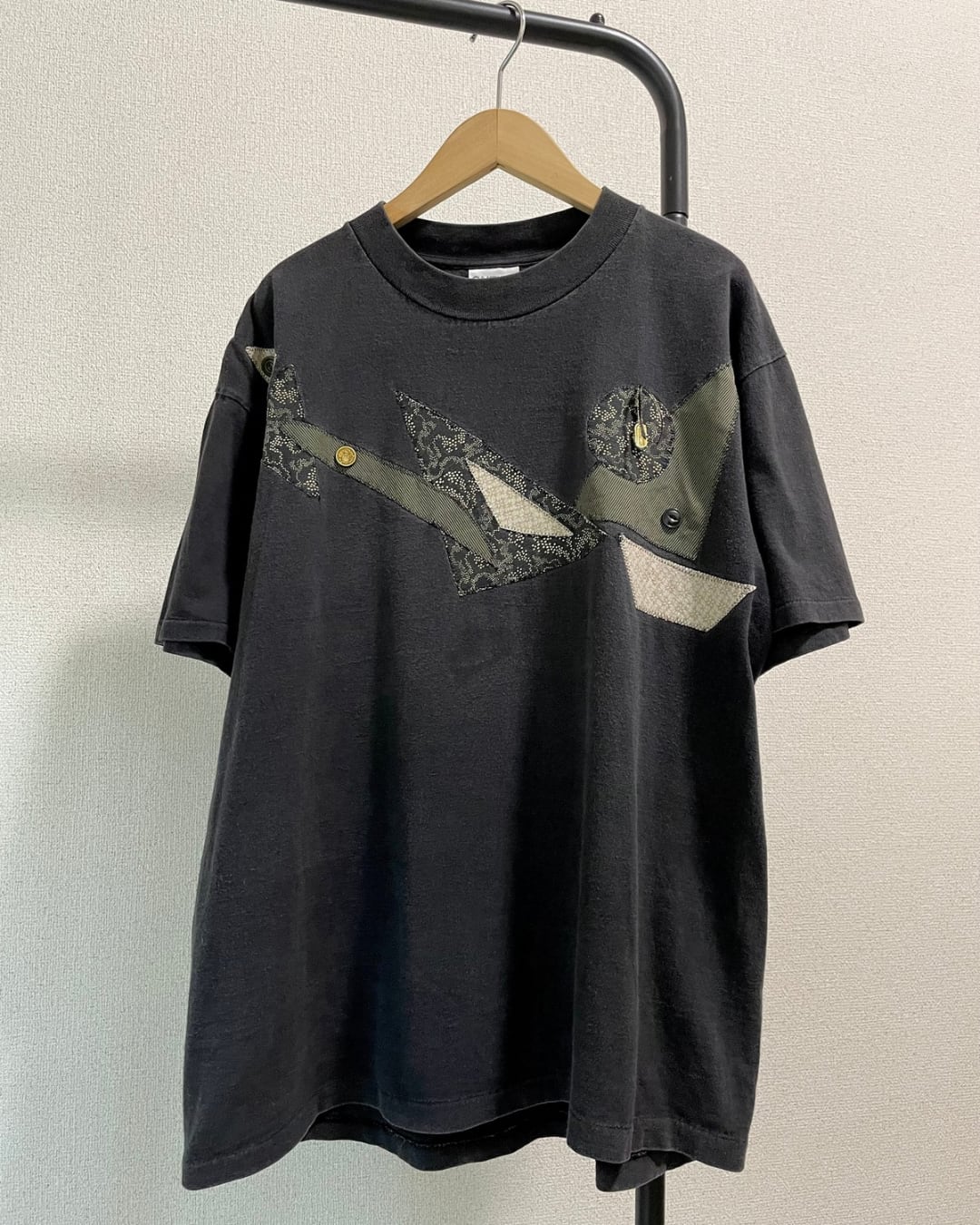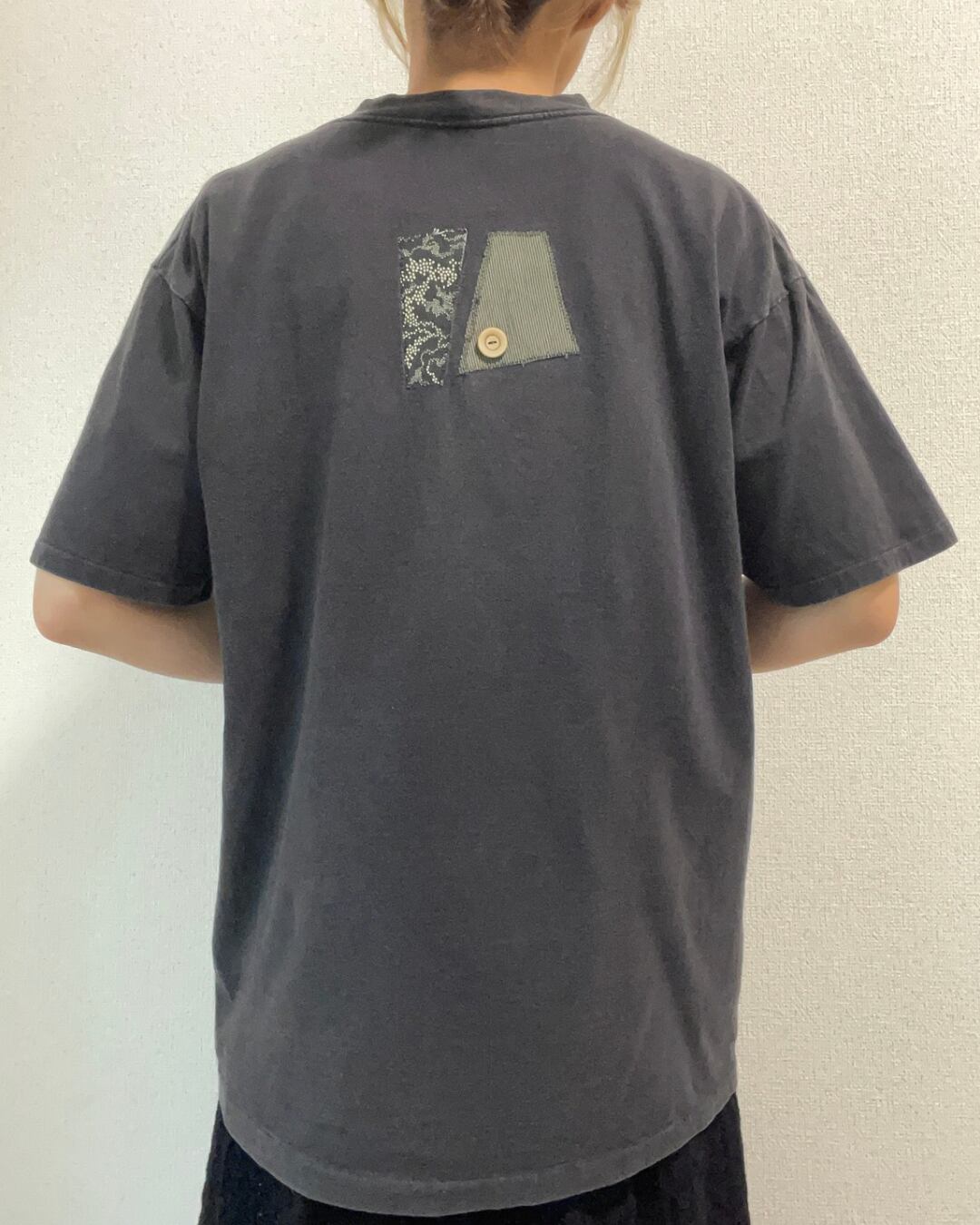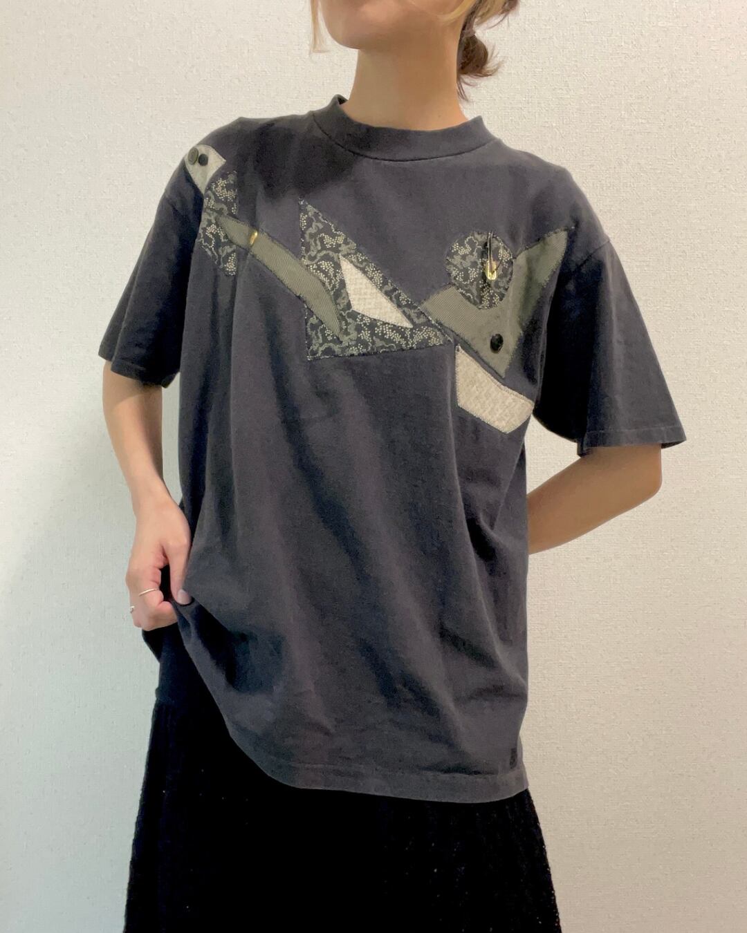 ボタンやパッチワークが散りばめられた、他にあまりないデザインのTシャツです。