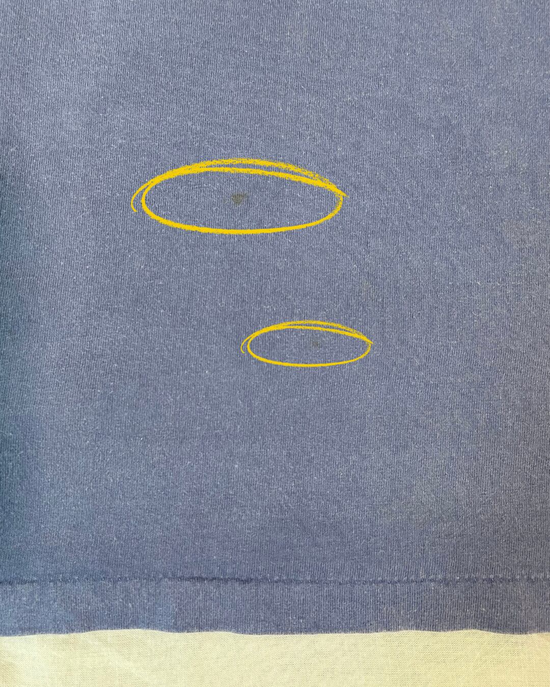 前の裾近くに2箇所、プリント付近に1箇所、うっすらとシミあり。