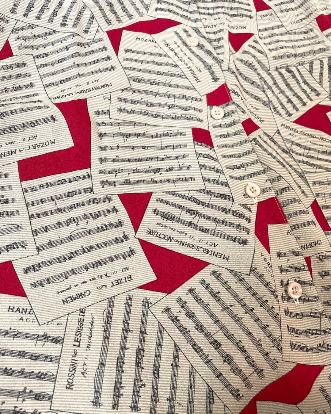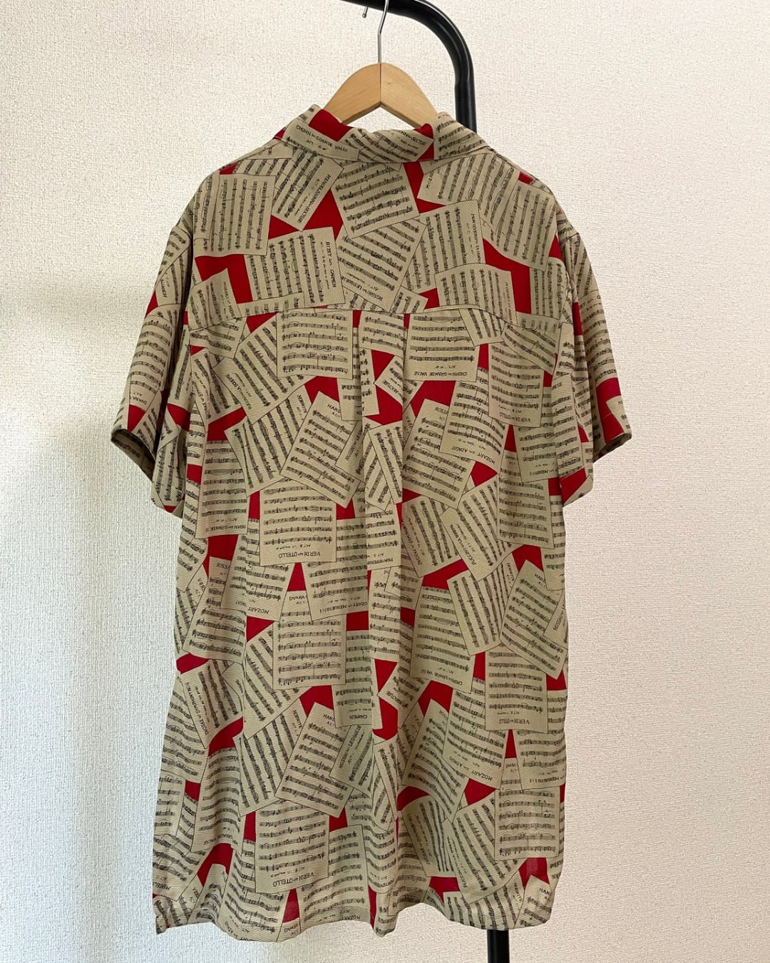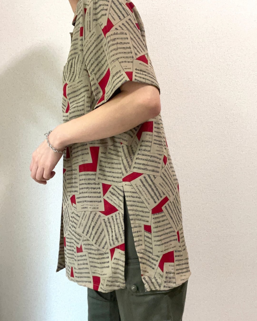 楽譜が散りばめられた総柄が印象的なシャツです。