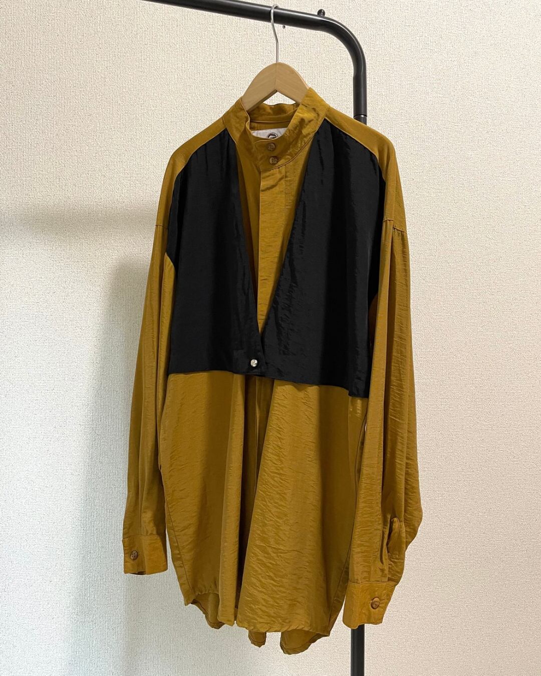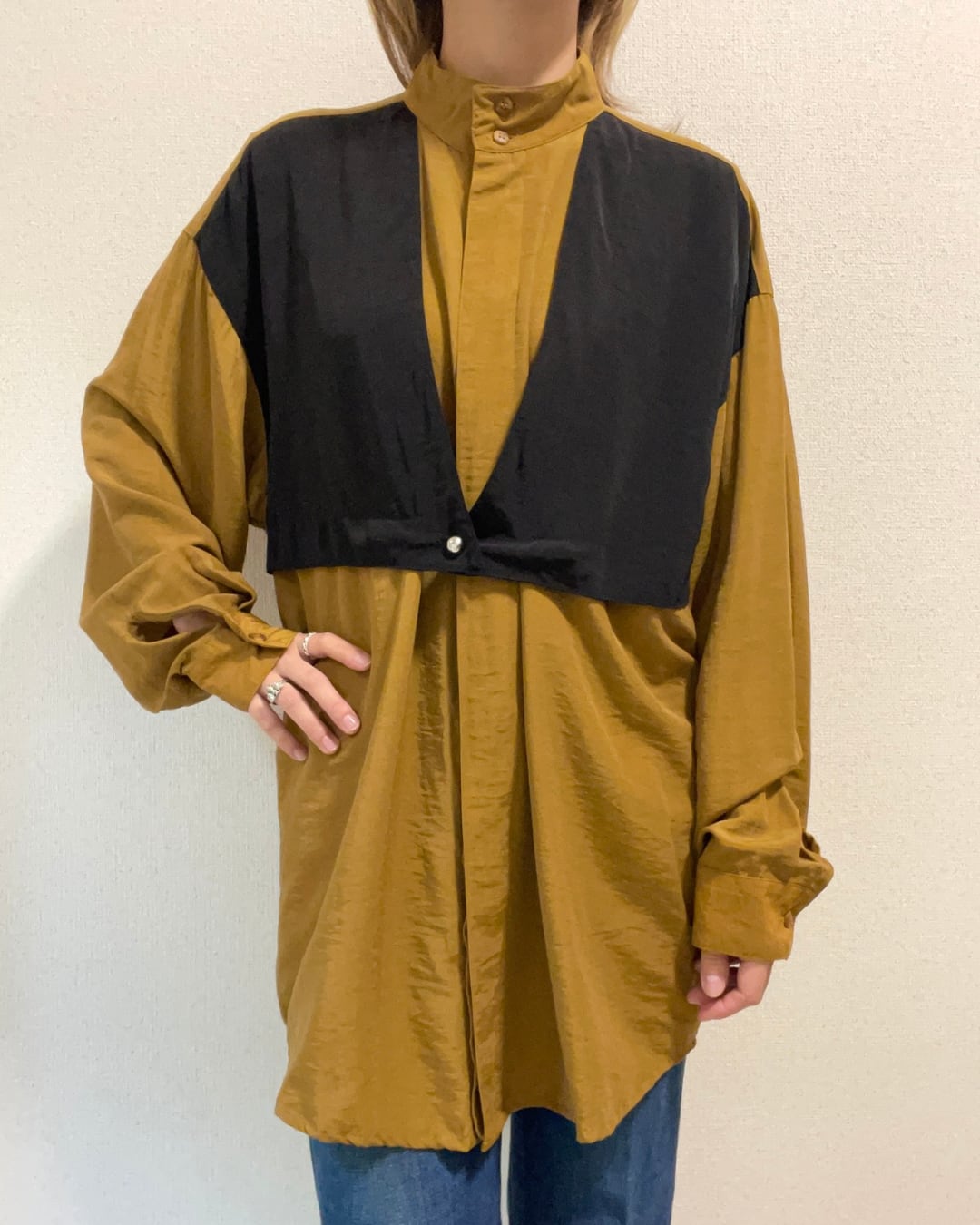 ハイネックのような衿と、まるで黒いベストを重ね着しているかのようなバイカラーデザインの組み合わせが、どこかモードな雰囲気。