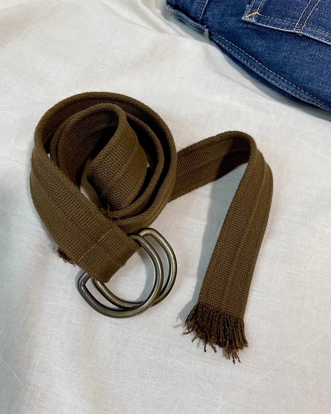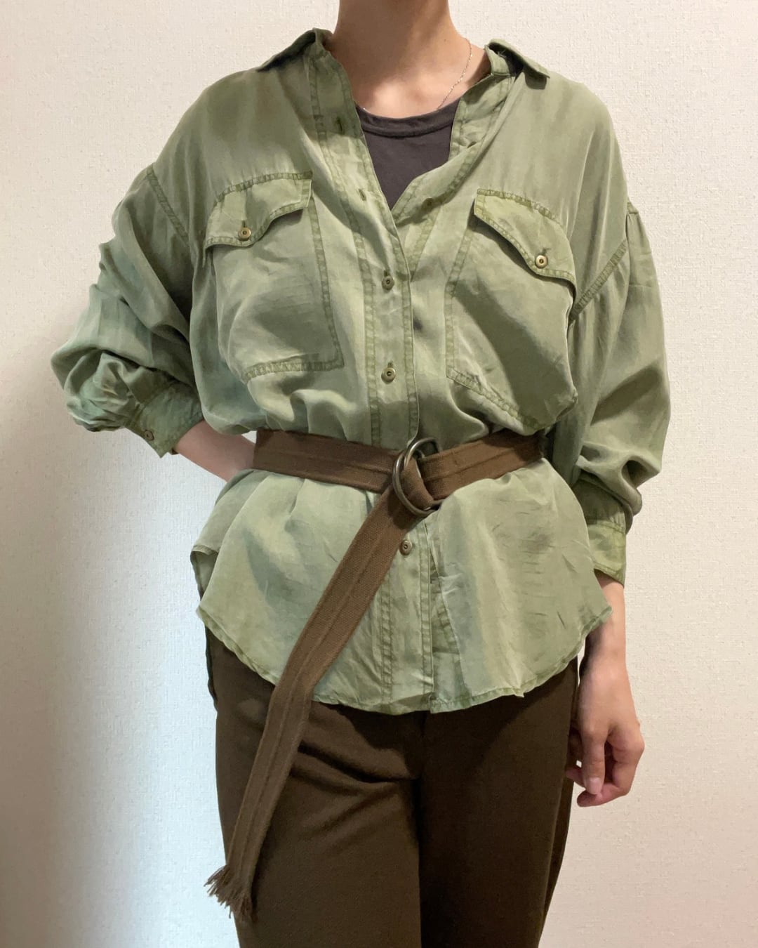 渋いダークブラウンのベルトにアンティークゴールドのバックルがとてもシックな雰囲気。