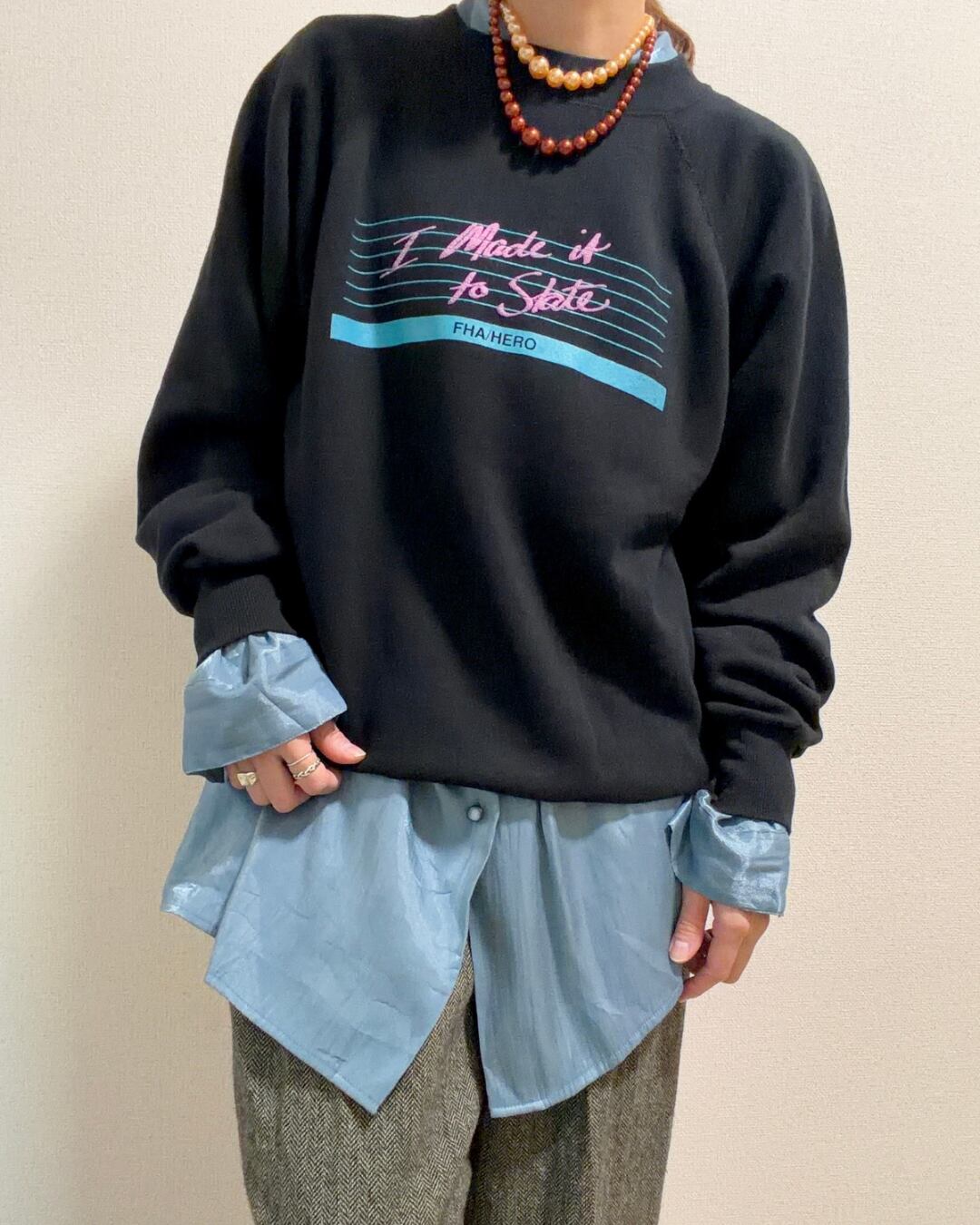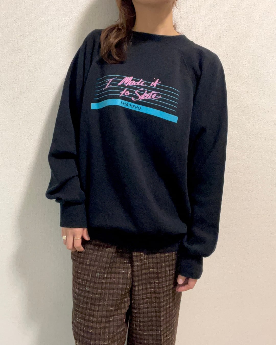 黒地にネオンカラーのロゴがレトロな雰囲気のUSA製のスウェットです。