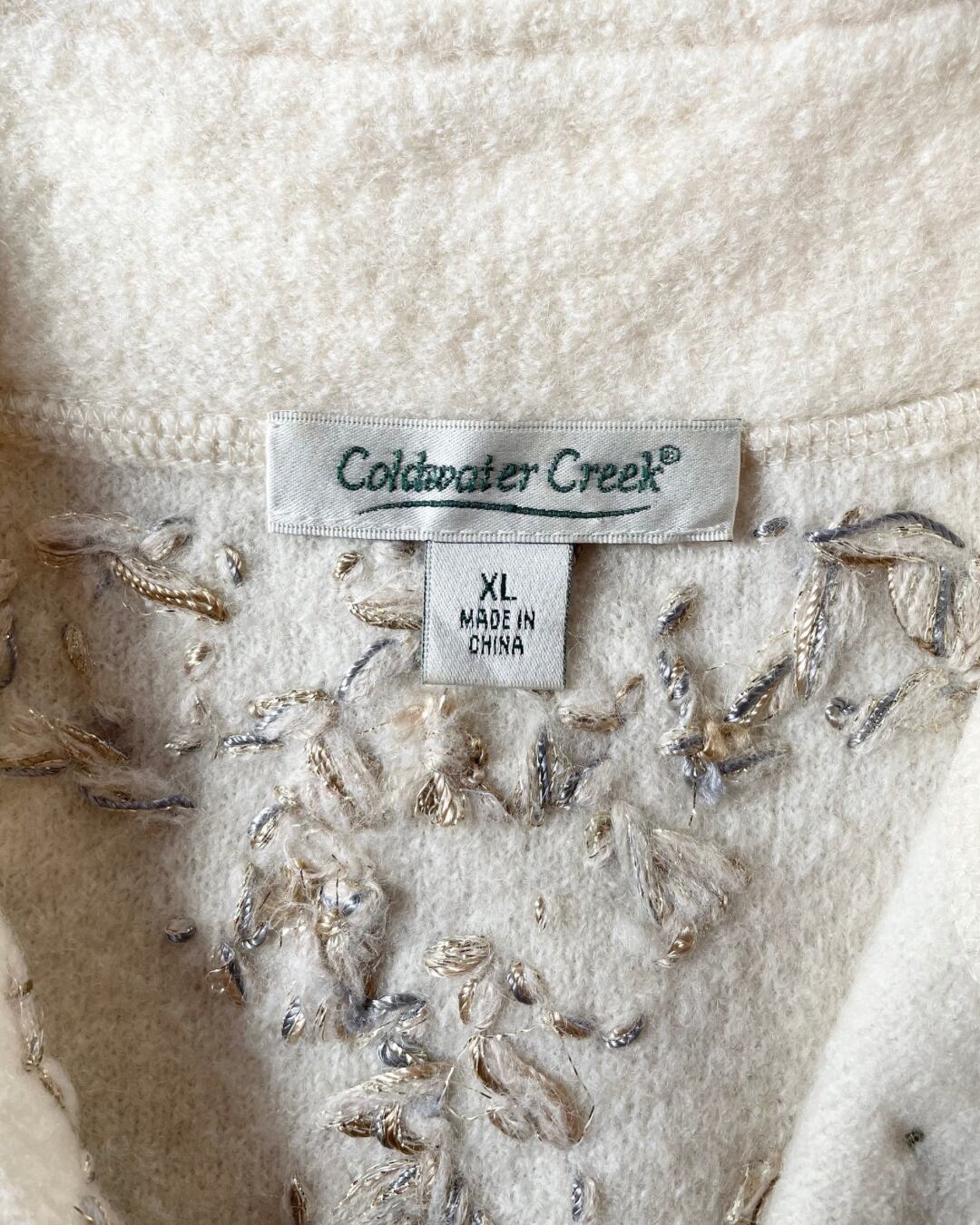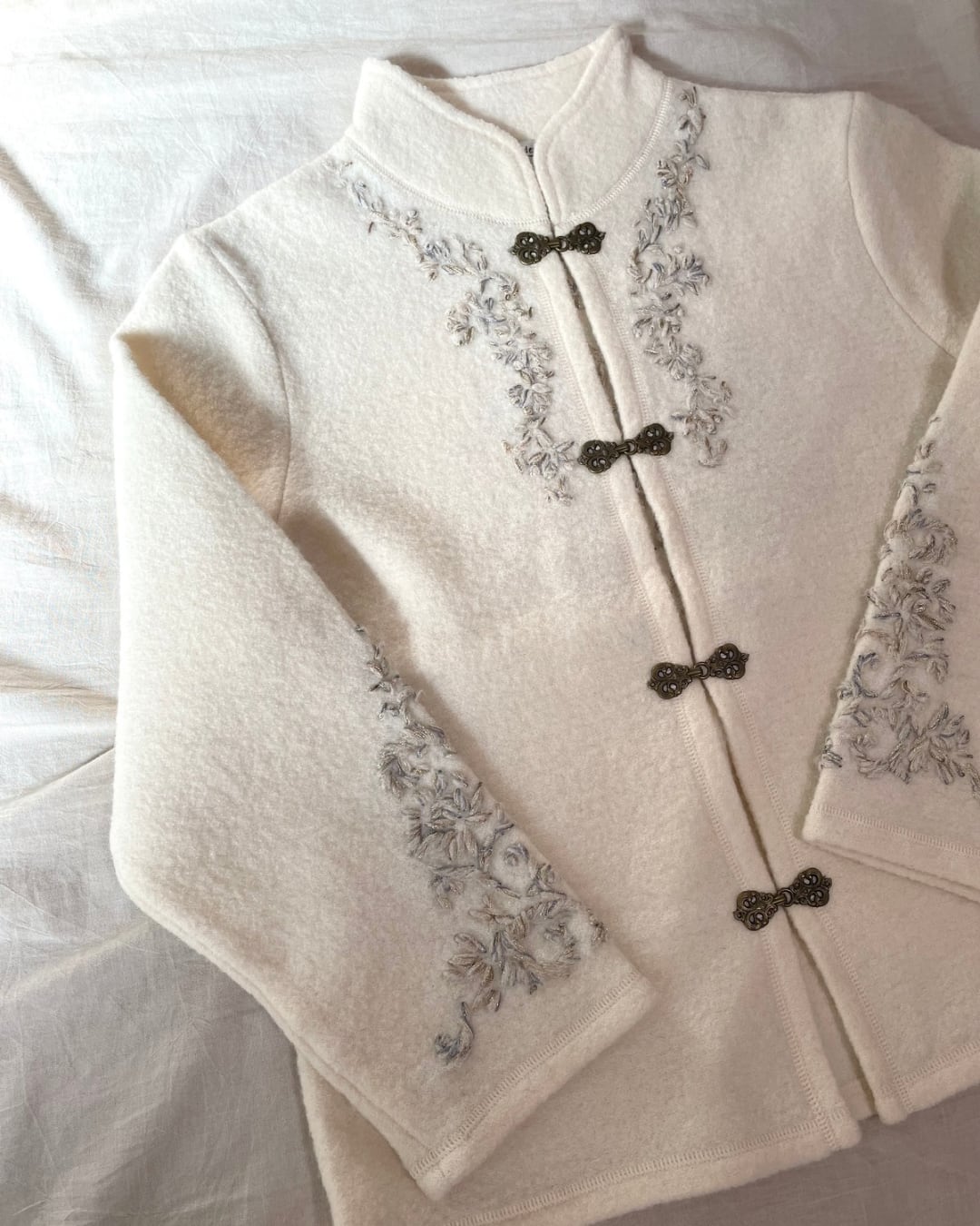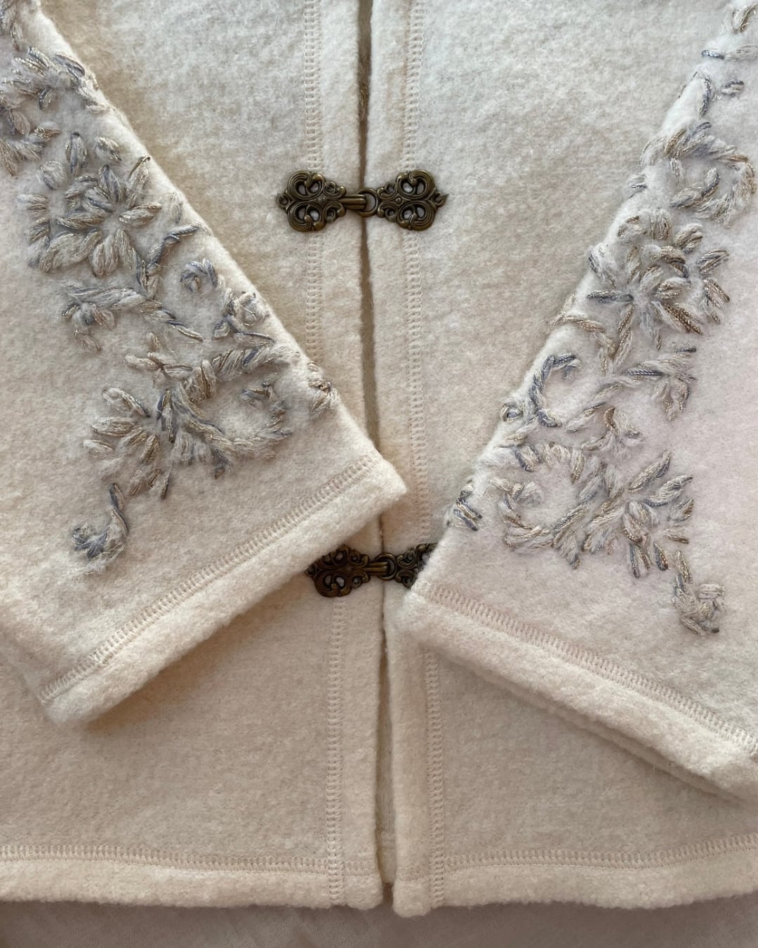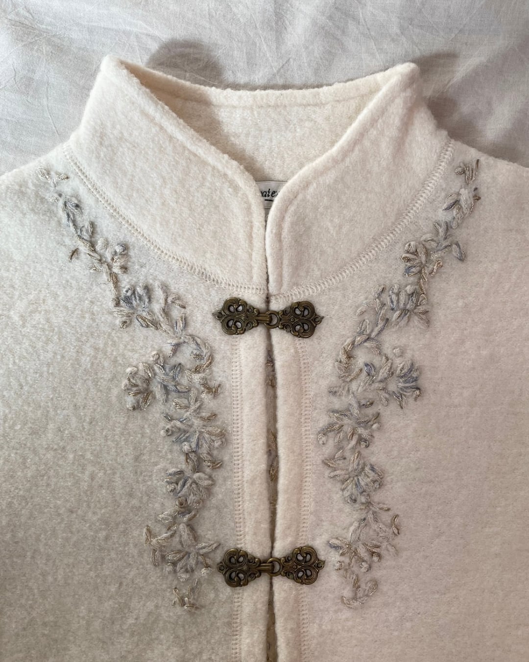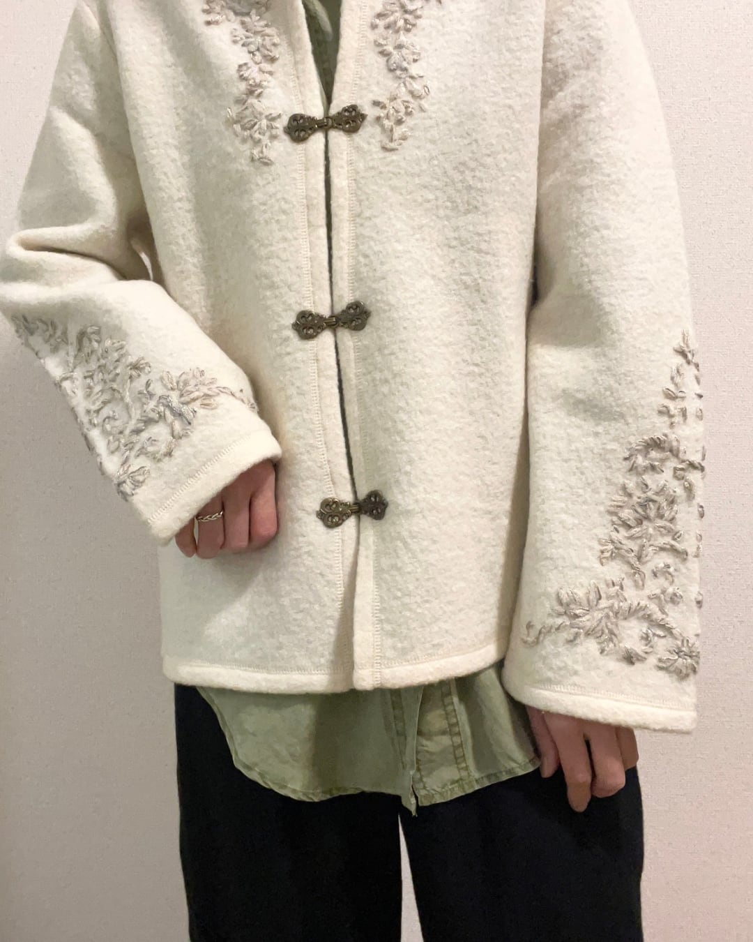 レトロな雰囲気の刺繍とチャイナボタンの組み合わせが素敵なウールニットカーディガン。