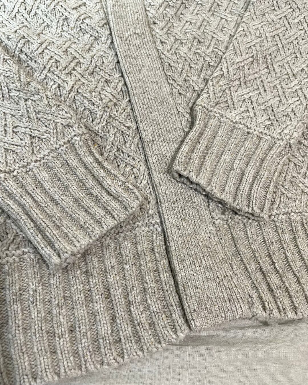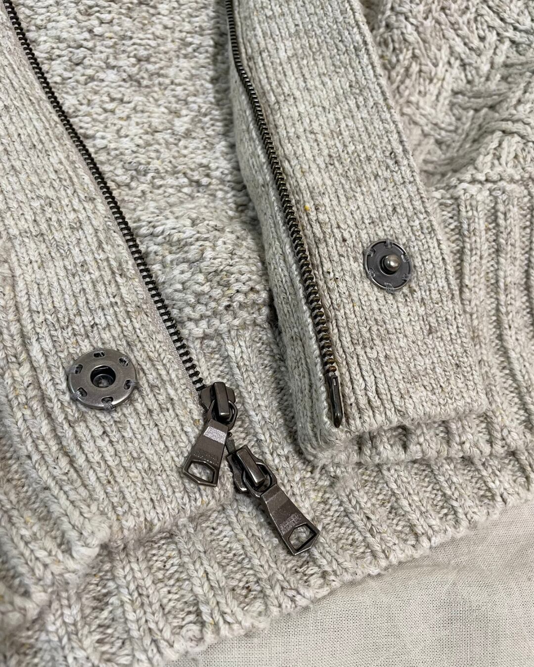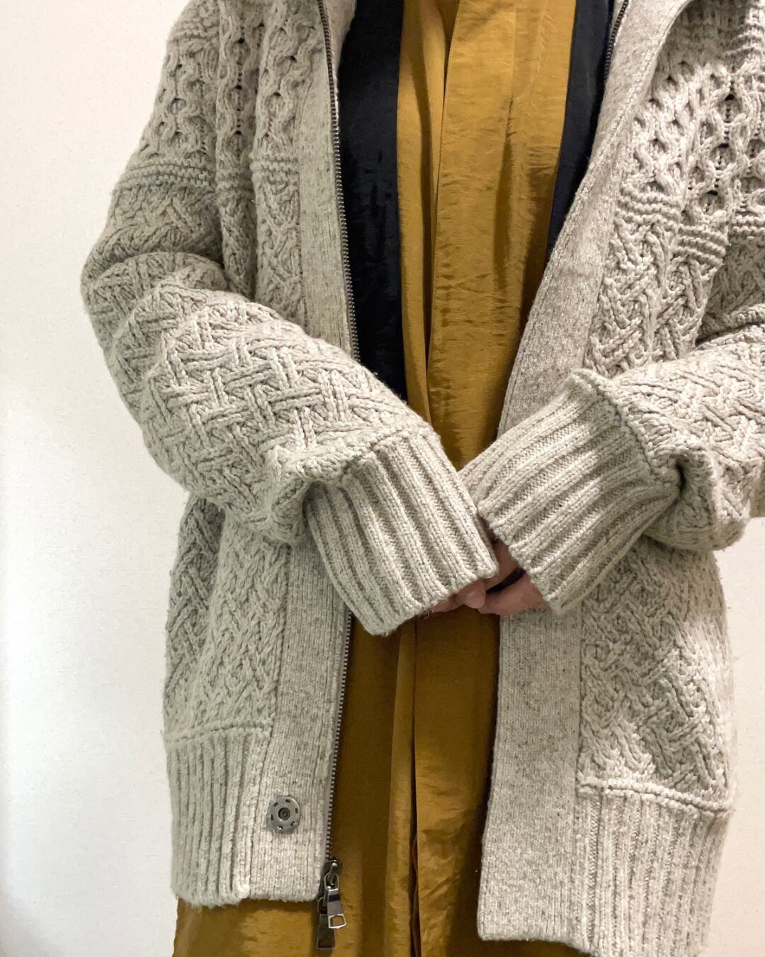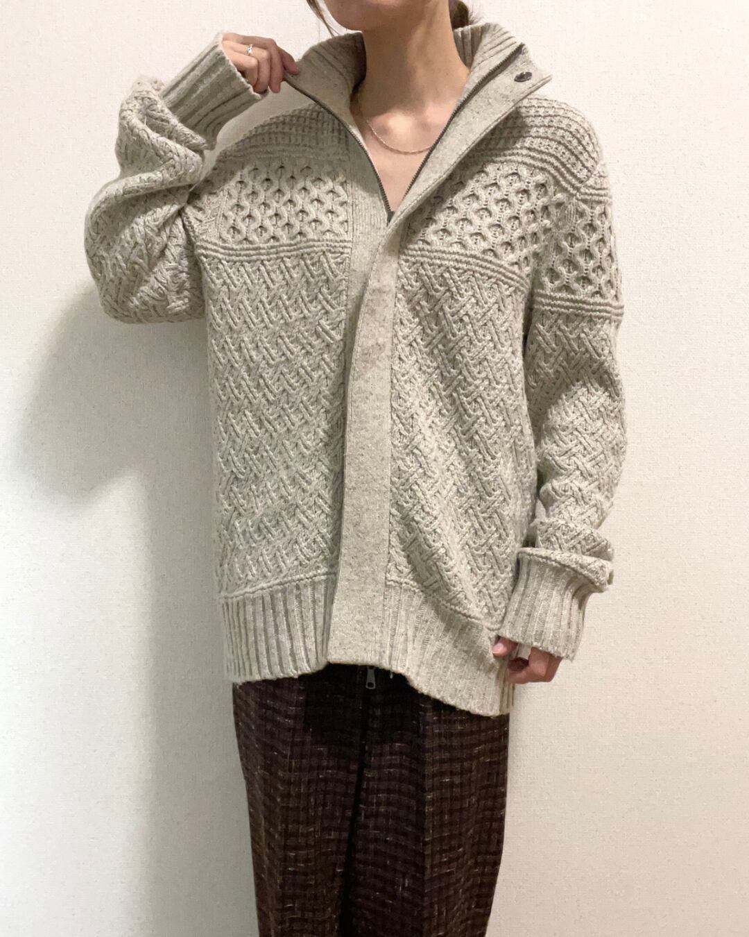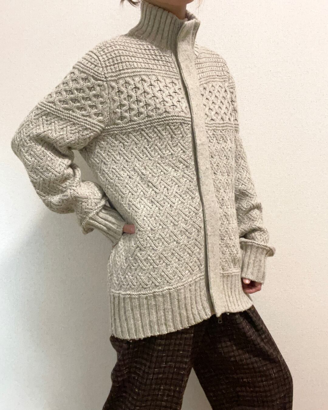ジップアップで羽織れるタイプのアラン柄ニットです。