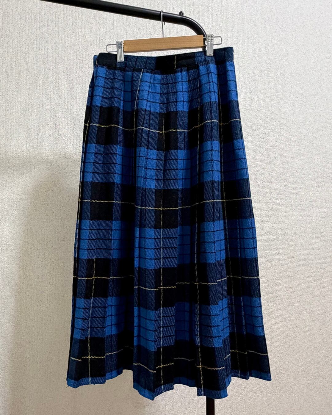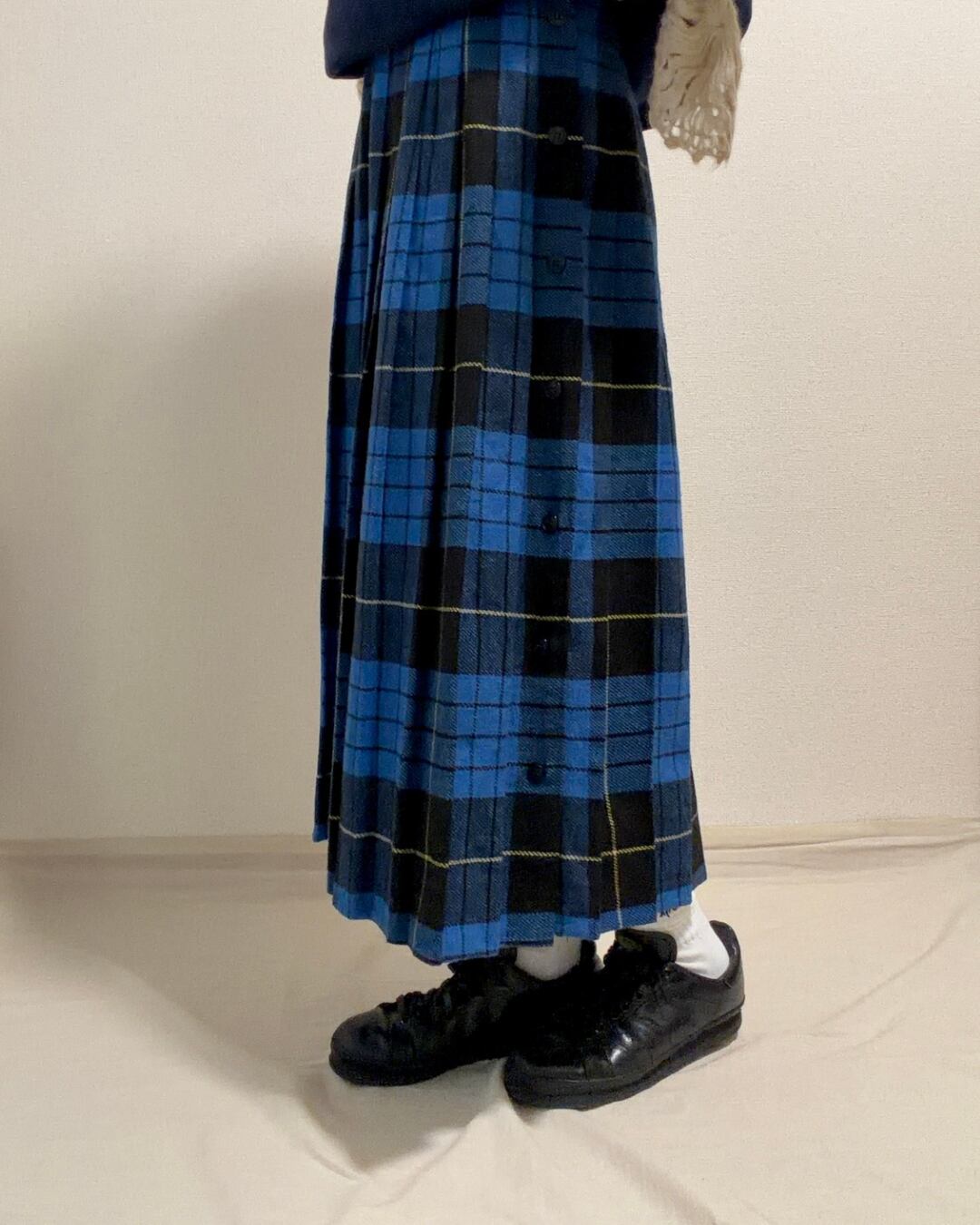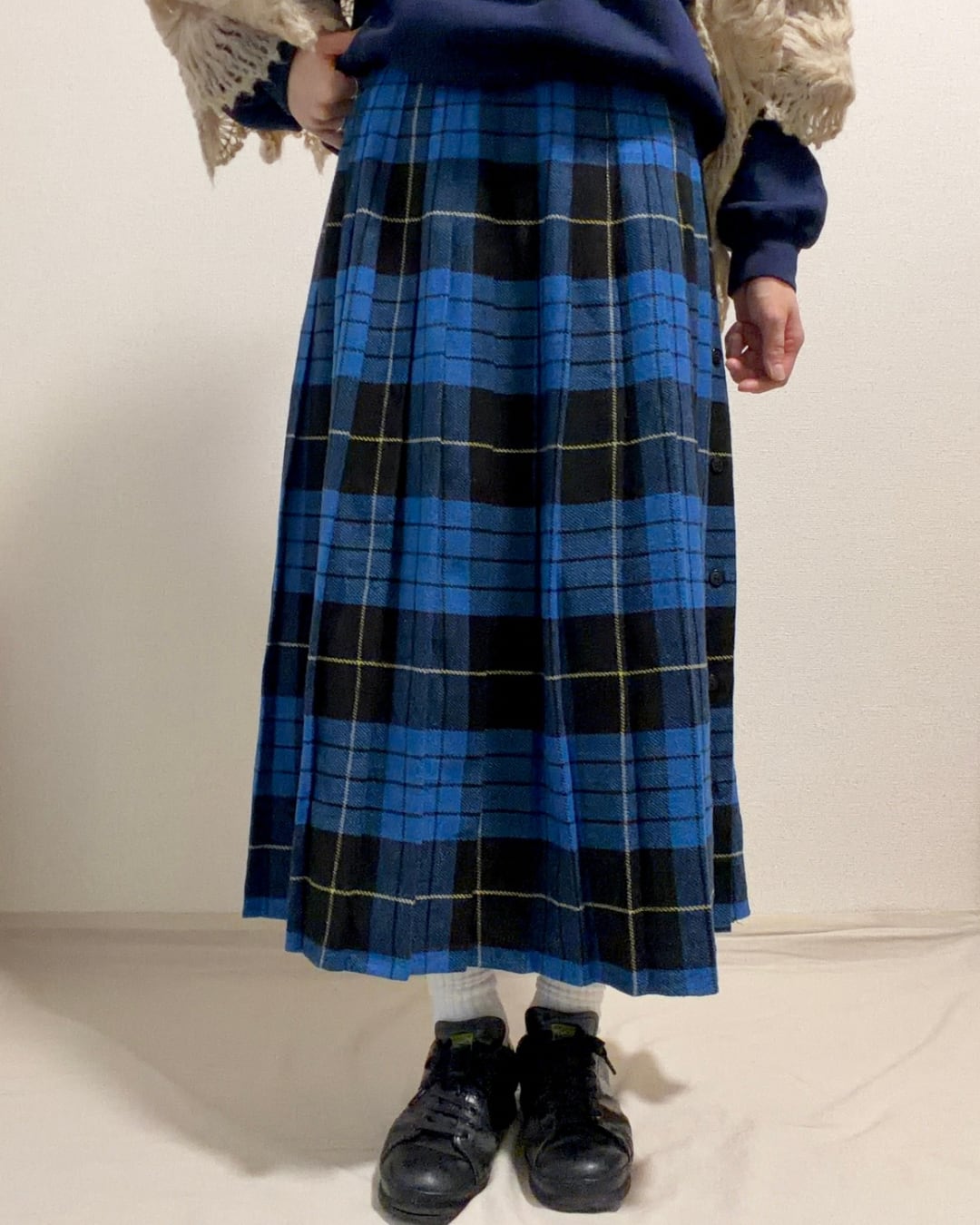 着方によっては幼く見えてしまいがちなタータンチェックスカートですが、ブルー × ブラックの色合いは程よい存在感があり大人のカジュアルスタイルにぴったりです。