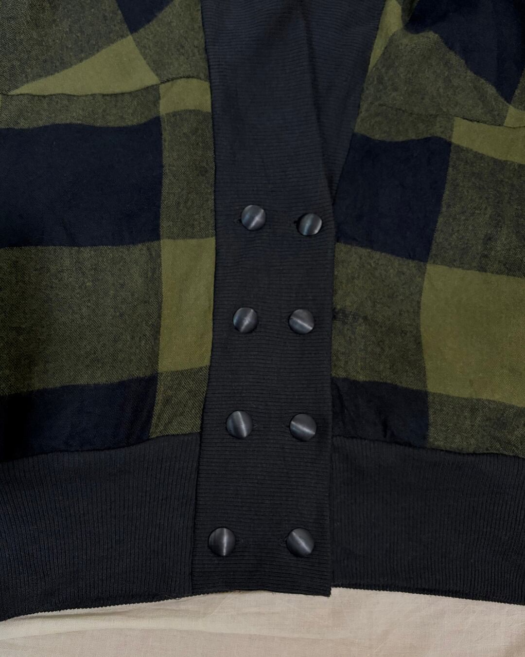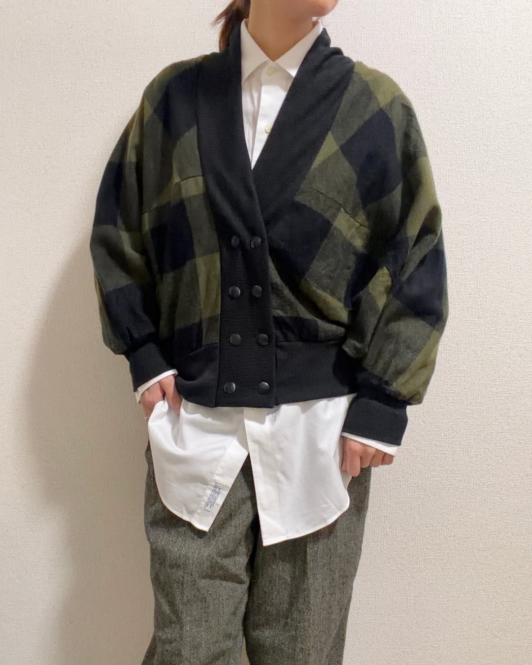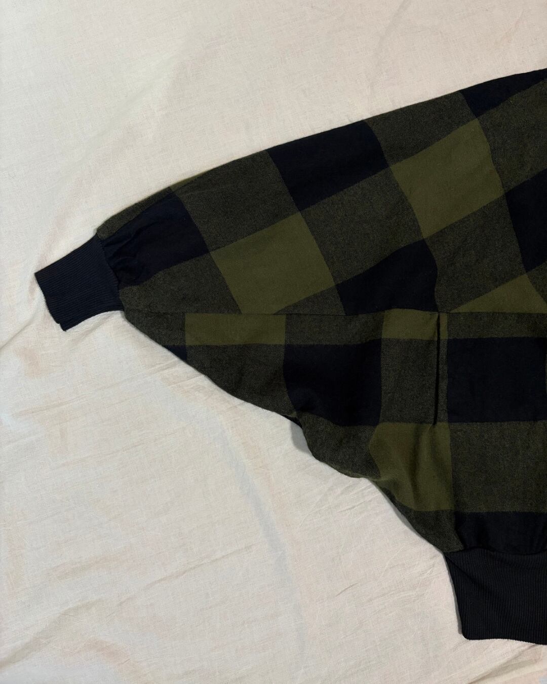 やや起毛感のある秋冬素材で、カーキ × ブラックのバッファローチェック柄という、とてもセンスの良い生地が使われています。