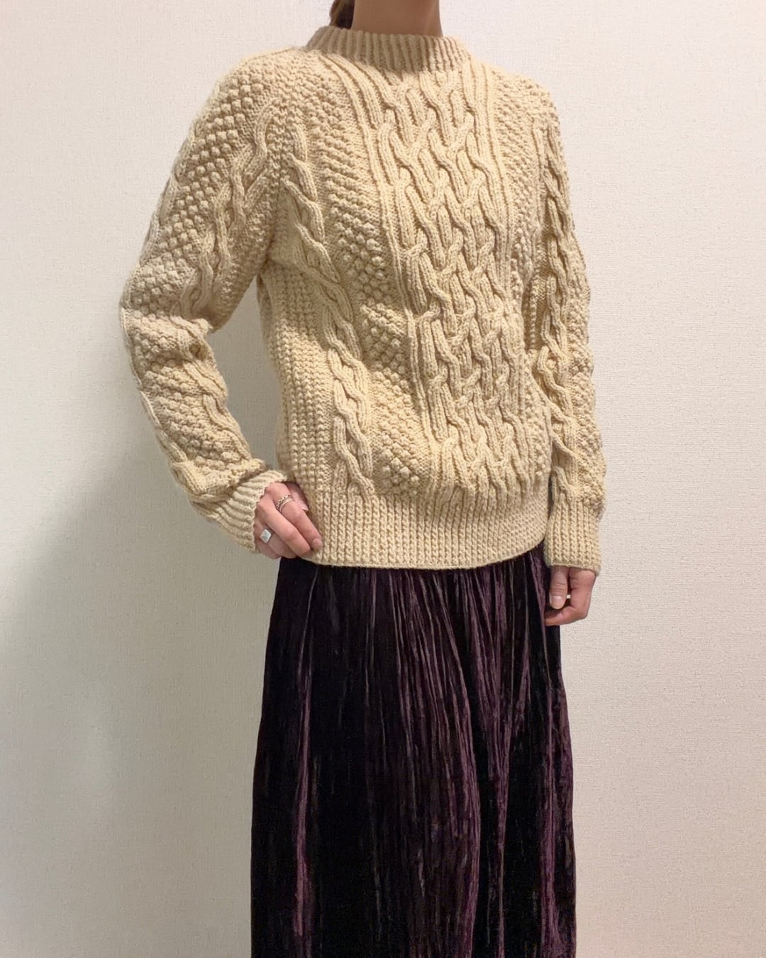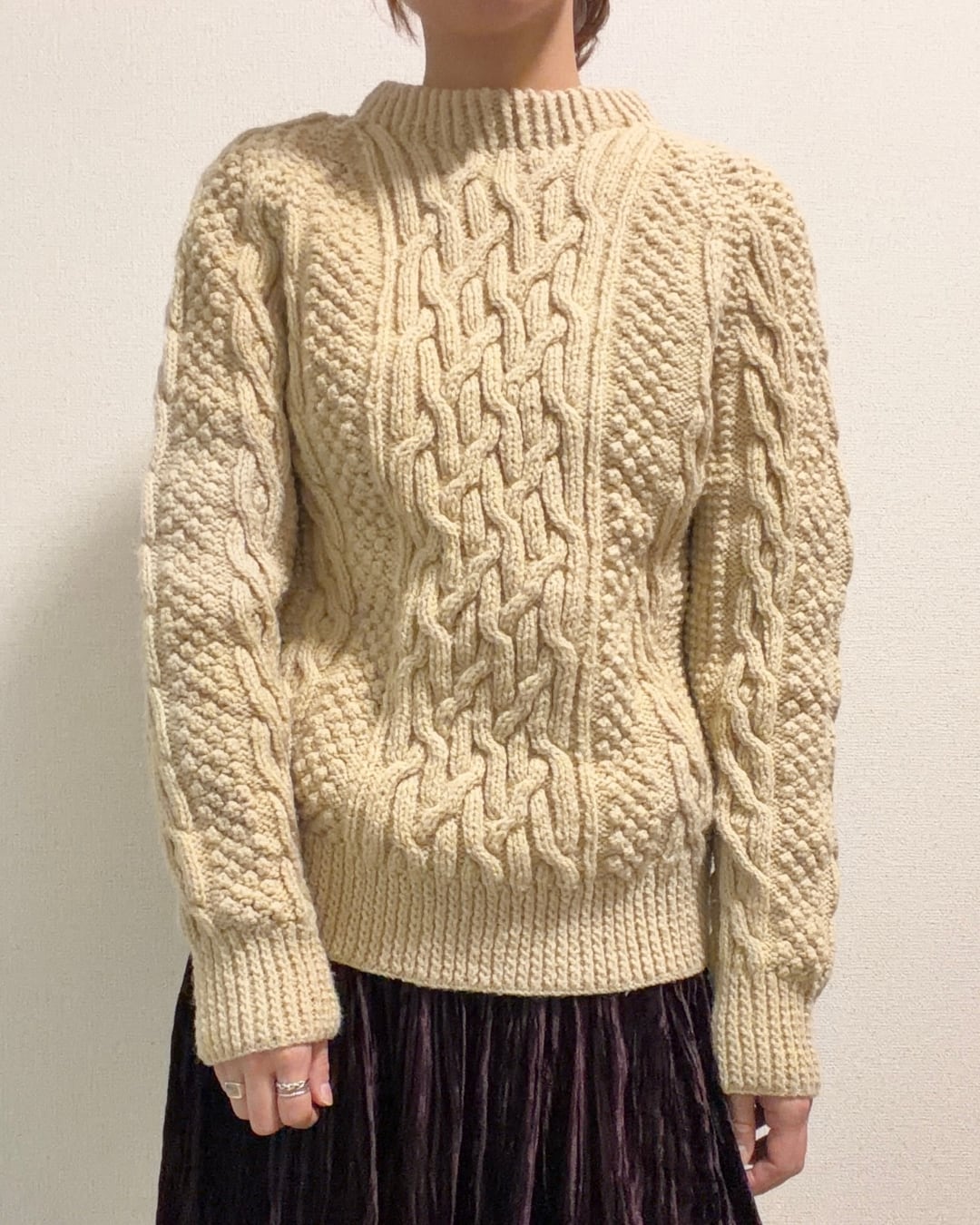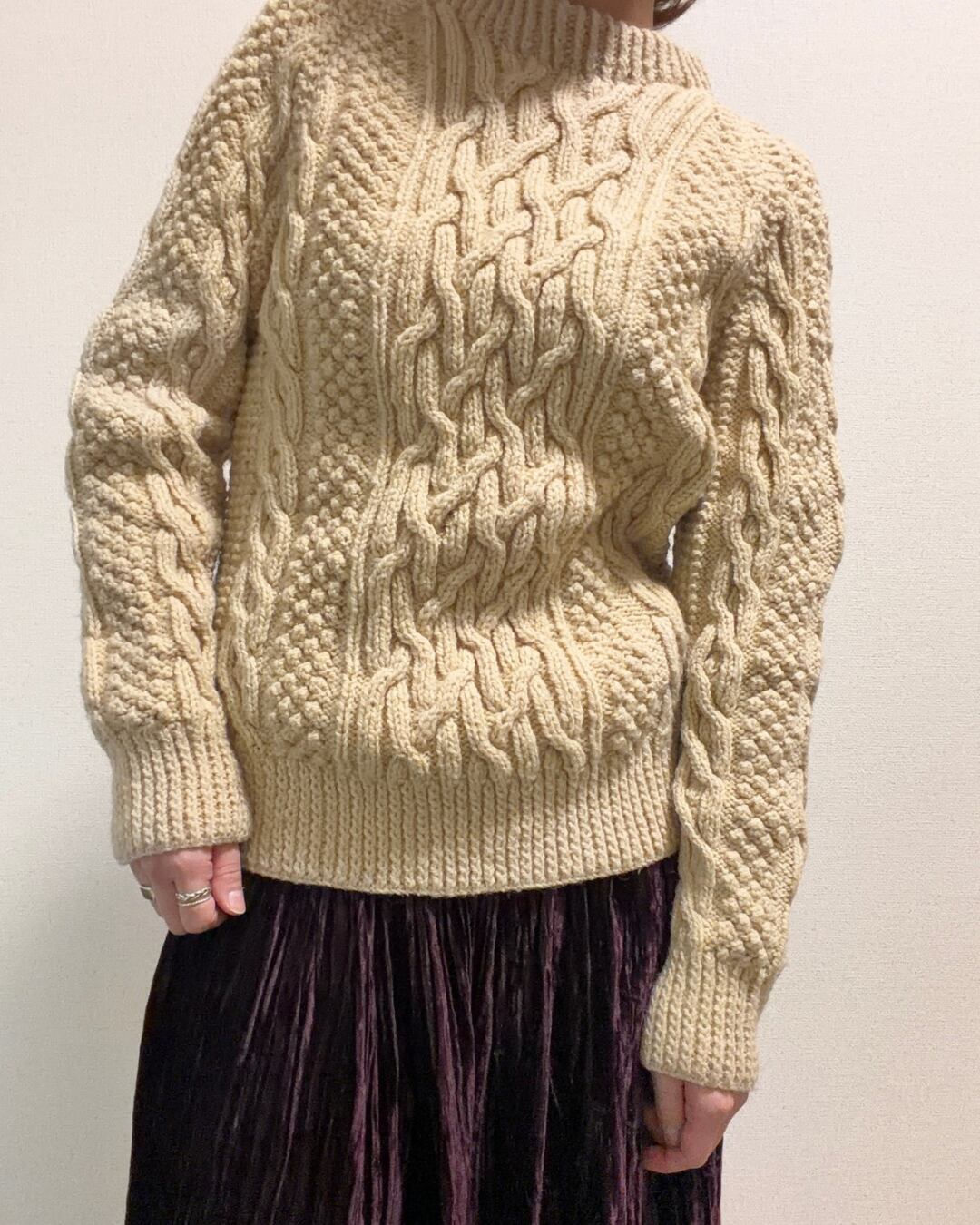 アイボリー ケーブル柄 アランニット