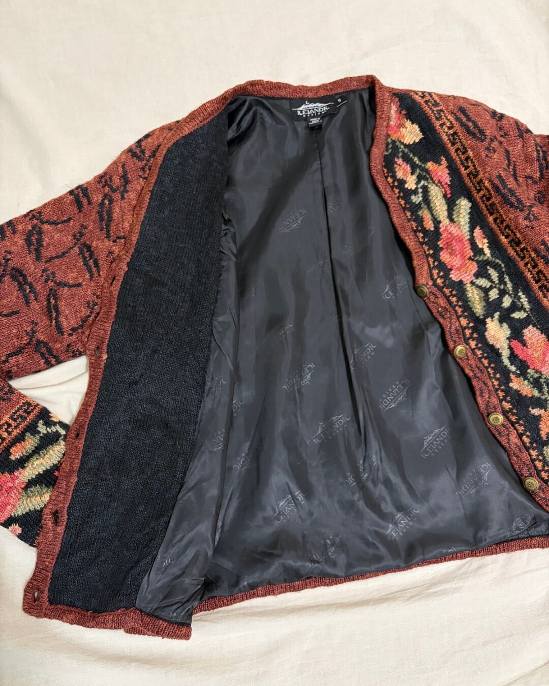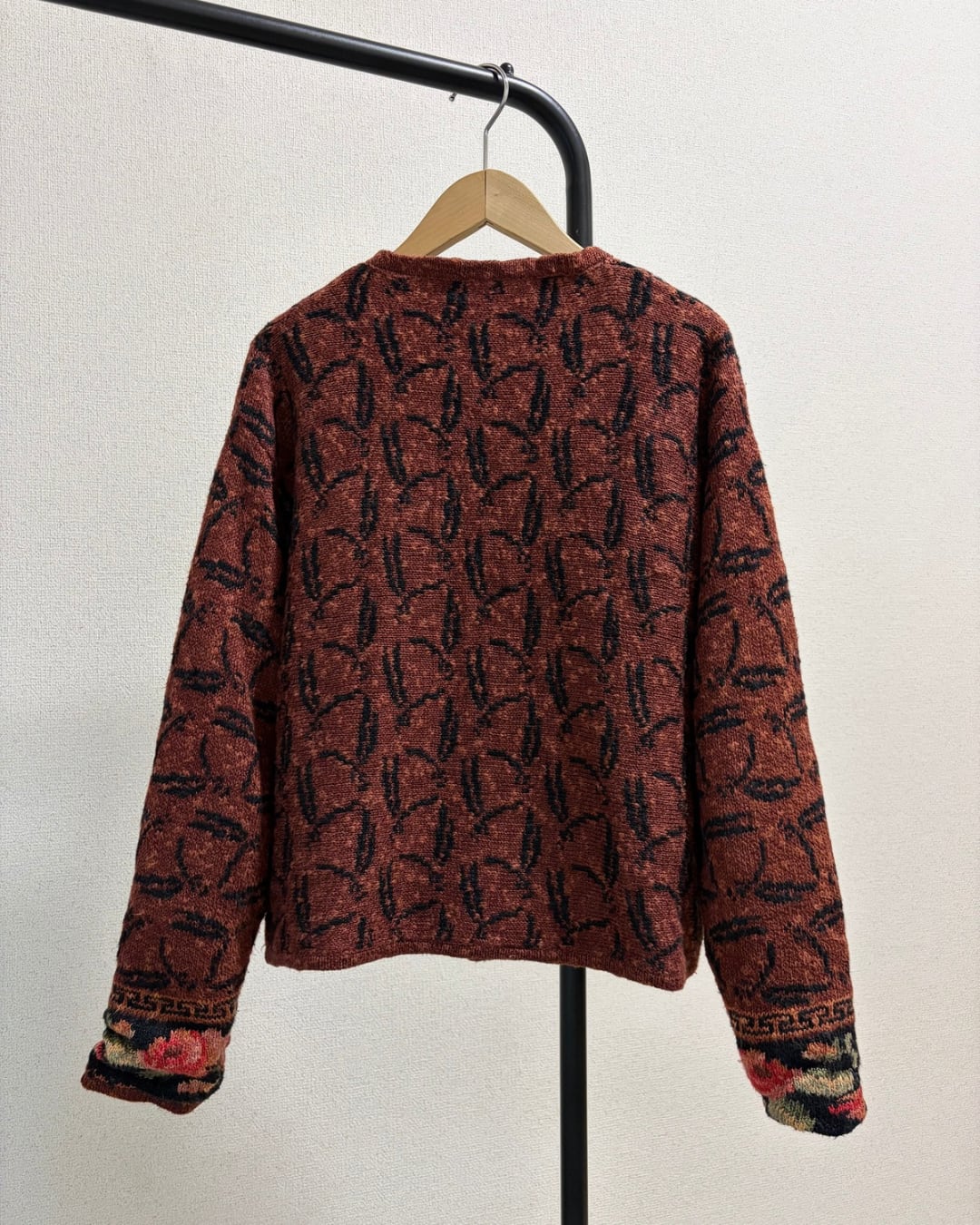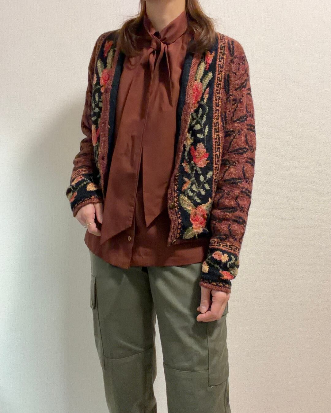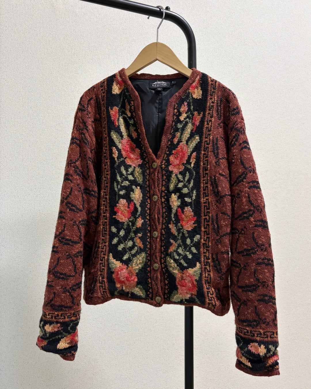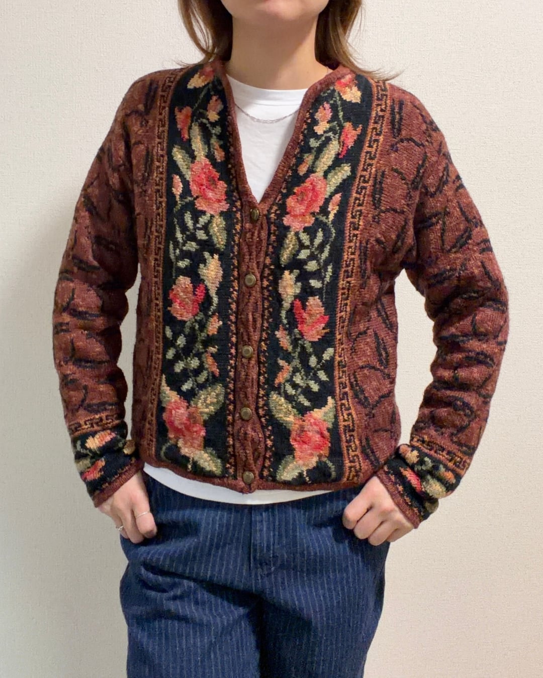 レトロな雰囲気の花柄と色合いが素敵なジャガードニットカーディガンです。