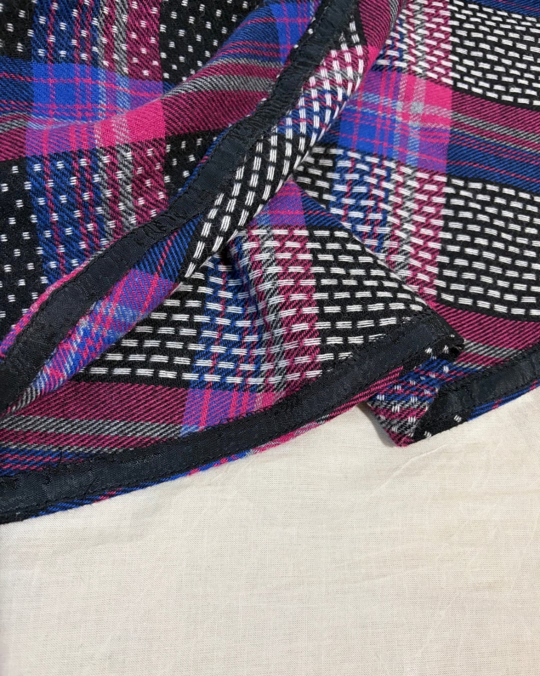 チェックの織り柄の中にドビードットのような細かい柄があり、現代ではあまり使われていないような手の込んだ生地です。