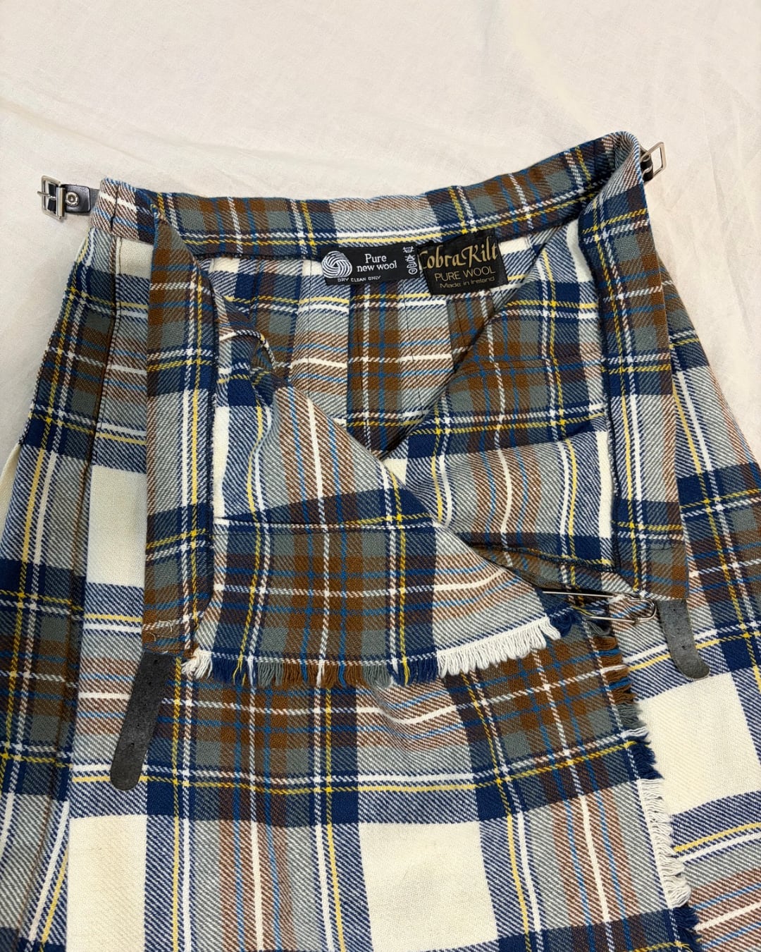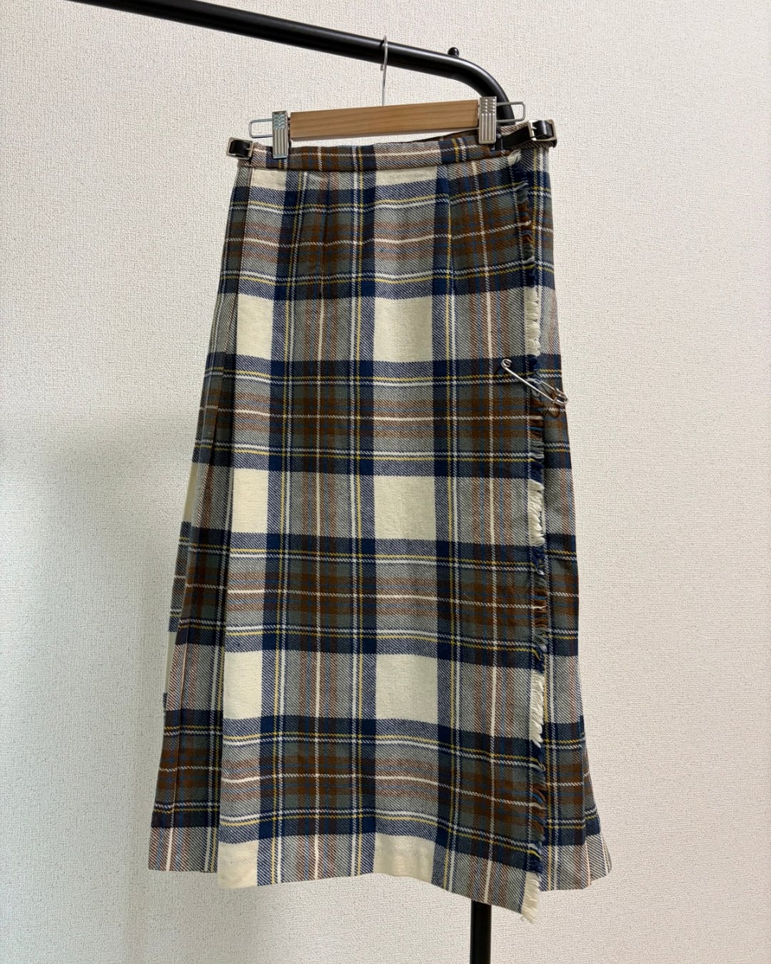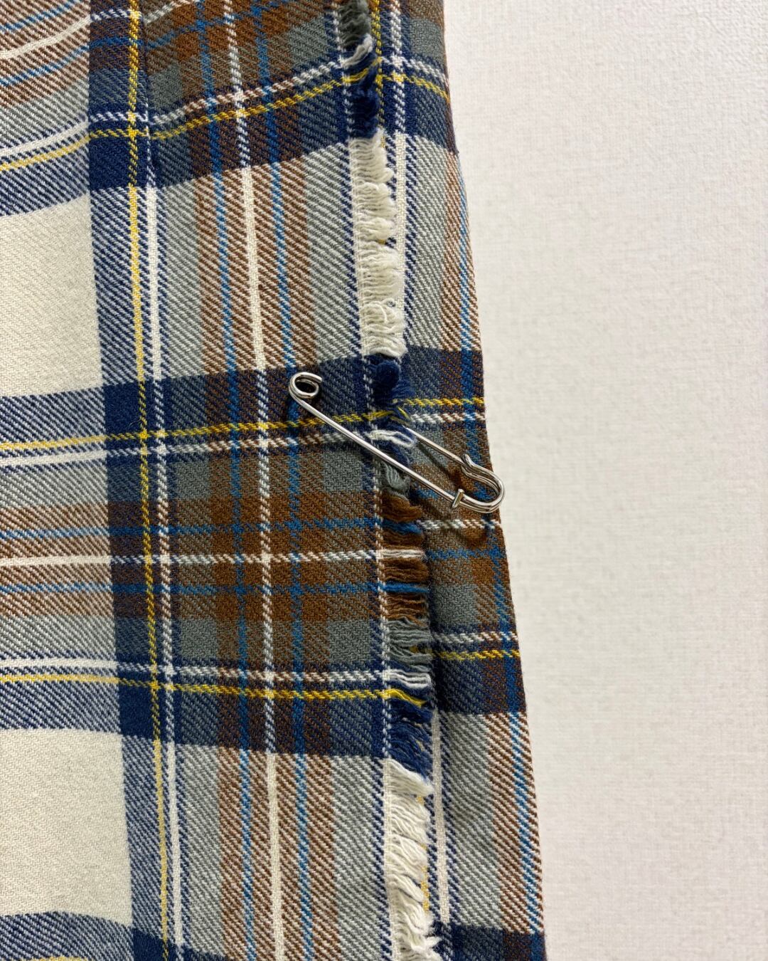両サイドのベルトでとめて着用する巻きスカートの形で、伝統的なキルトスカートらしい、キルトピンも付いています。