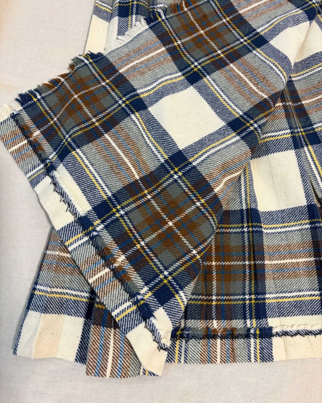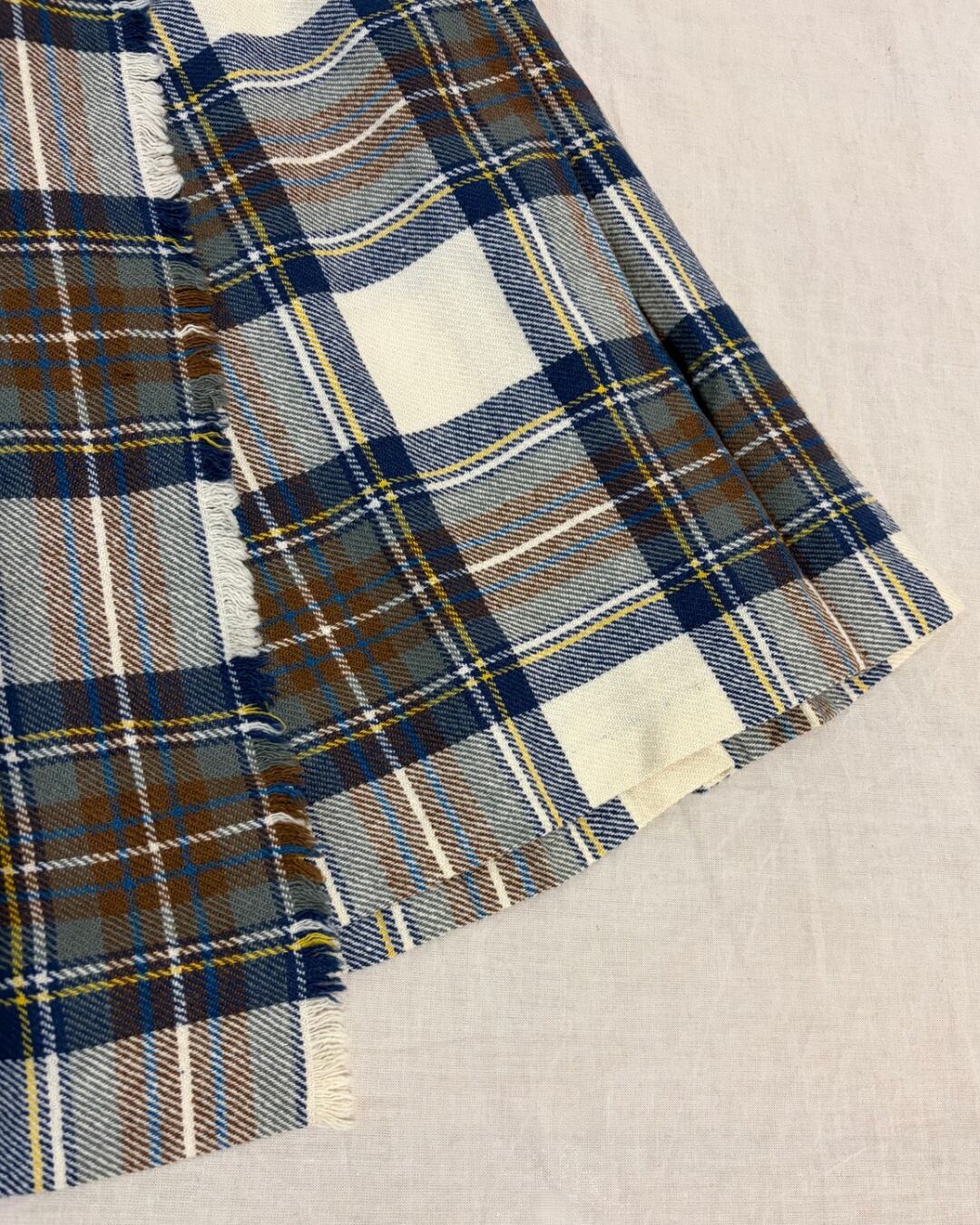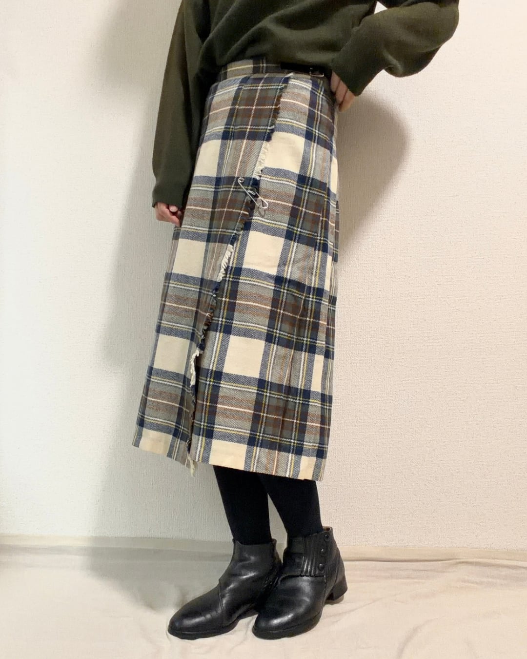 両サイドのベルトでとめて着用する巻きスカートの形で、伝統的なキルトスカートらしい、キルトピンも付いています。