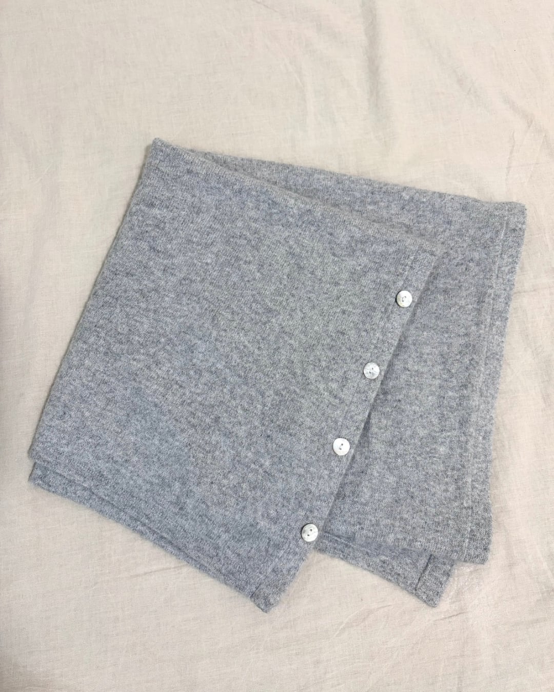 平置きするとシンプルな長方形で、端に取り付けられたボタンのとめ方によって2パターンの着方ができます。