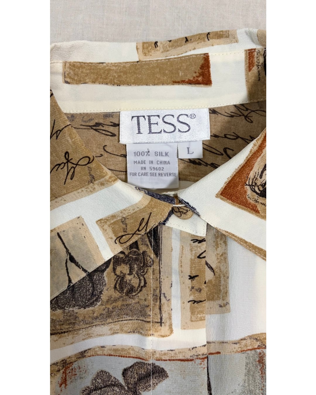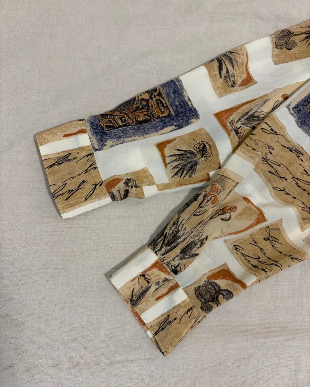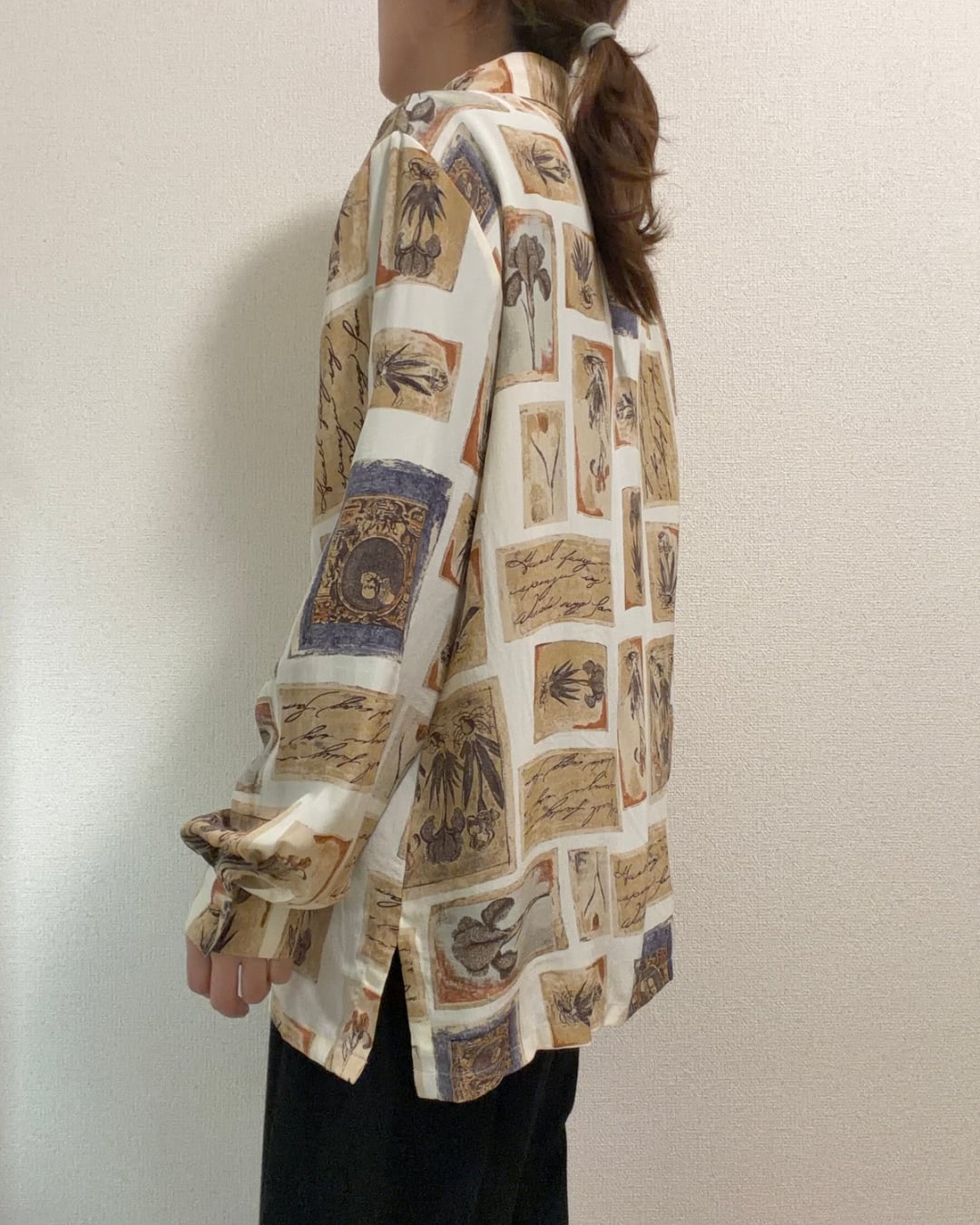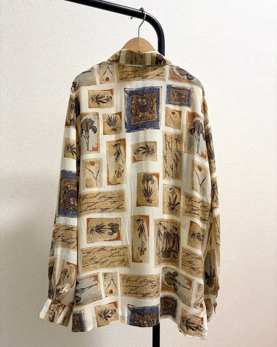 植物や人物、筆記体の文字などの様々なモチーフが描かれたクラシカルな雰囲気のシャツです。