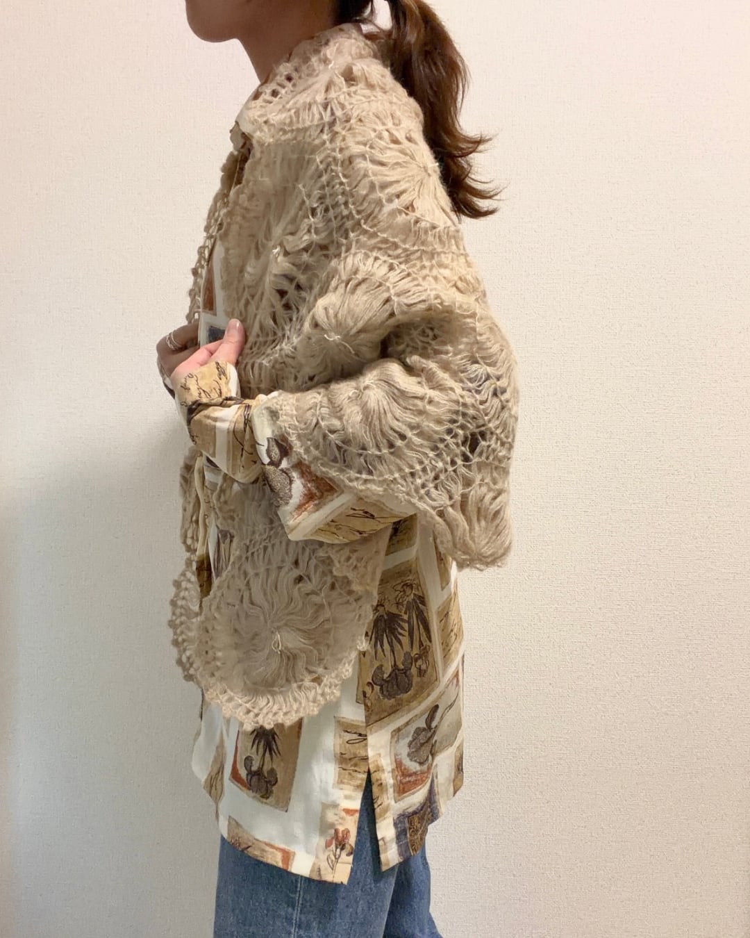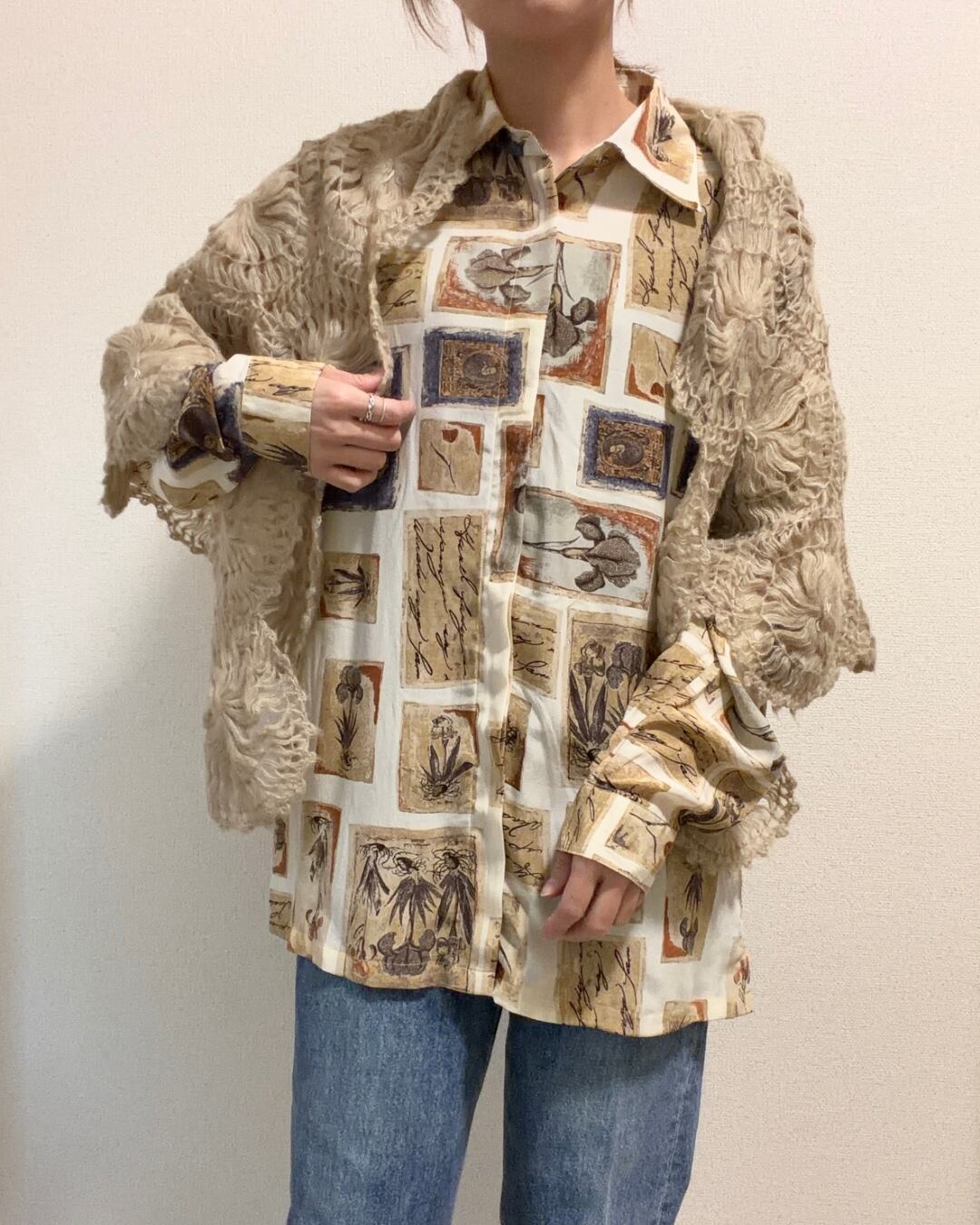 落ち着きのあるカラーリングで、1枚で着こなしてもあまり派手になりすぎない、上品な総柄です。
