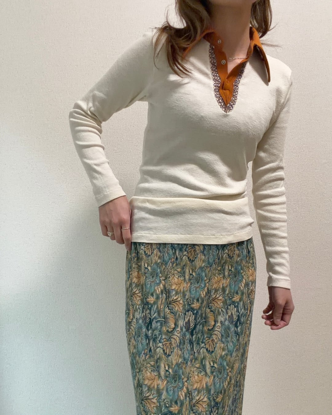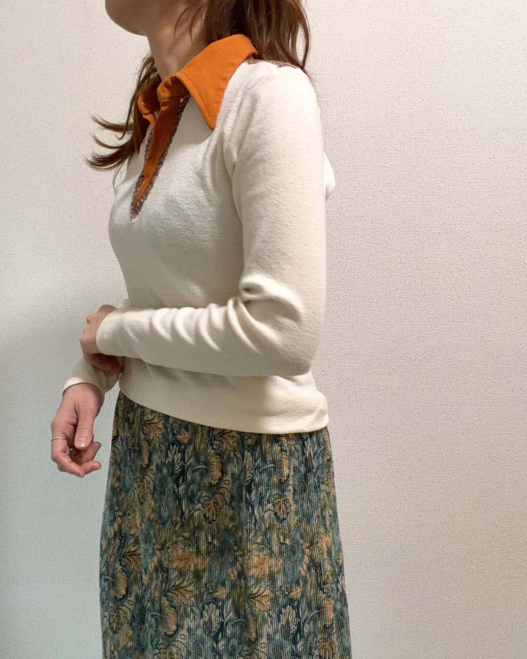 上品なキナリ色に、テラコッタ色の大きめ衿がこの年代のヴィンテージ古着ならではのいい雰囲気を出しています。