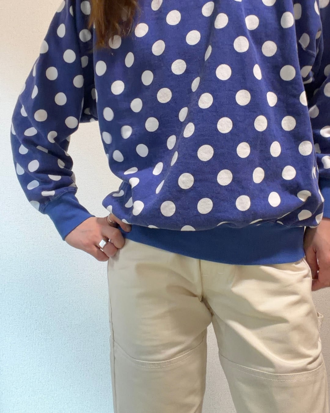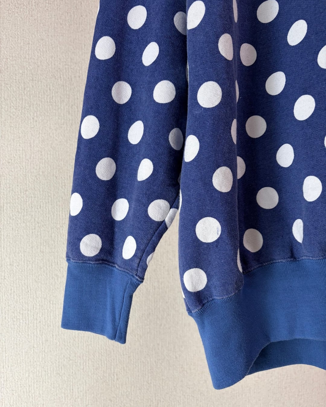 全体にドット柄がプリントされた珍しいデザインのスウェットです。