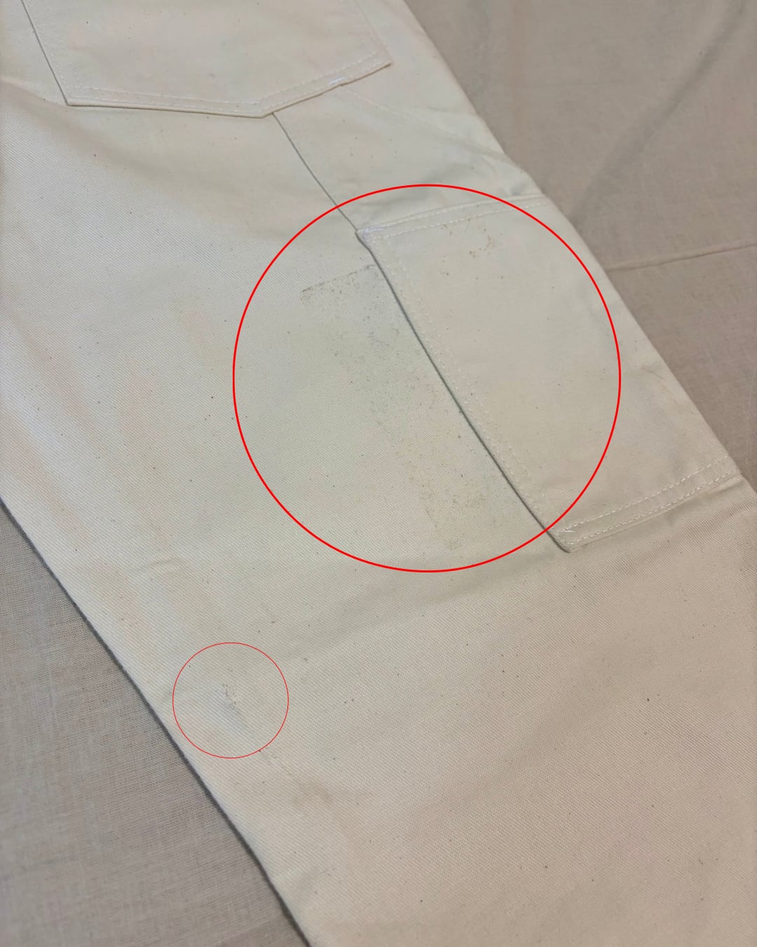 右側のサイドポケット後ろ側にうっすらと汚れがあり、その横の折り目の部分に小穴があります。