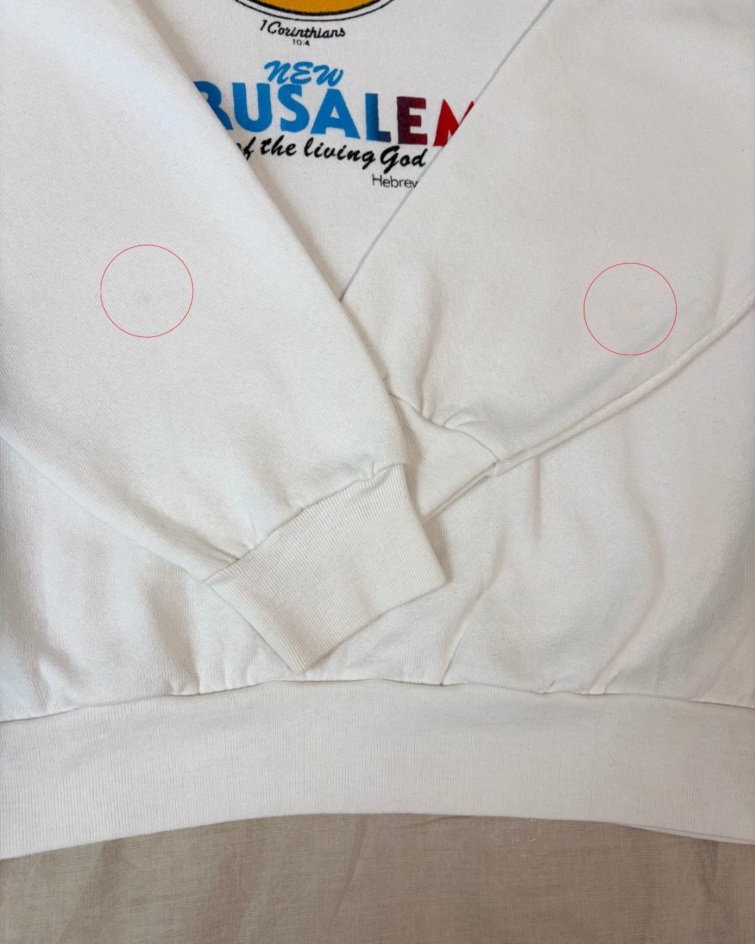 前のロゴ付近、袖、後ろなど数カ所にうっすらと汚れあり。あまり目立ちませんが、画像をご確認下さい。