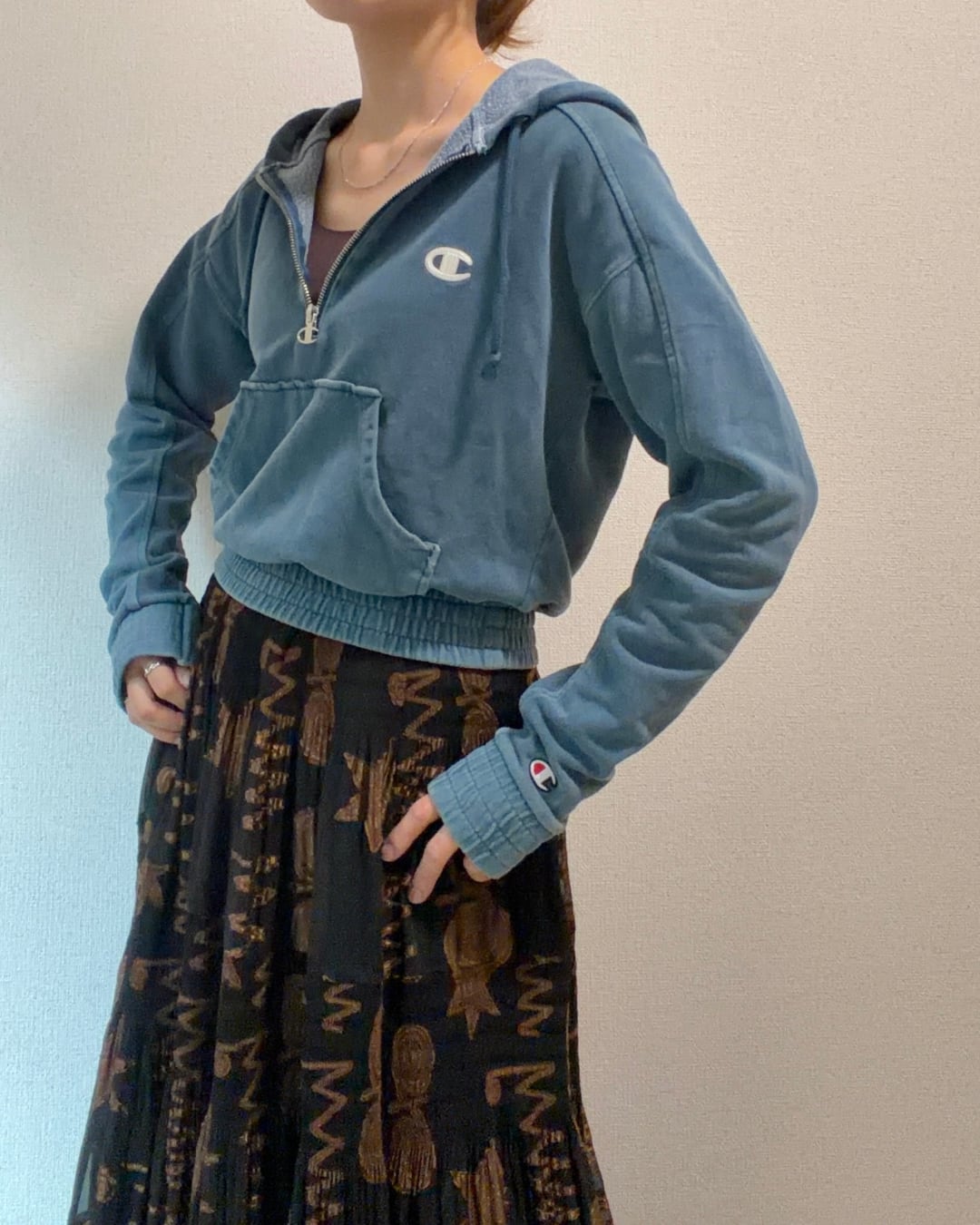 ハーフジップで着脱もしやすい形の「チャンピオン」のフーディースウェット。