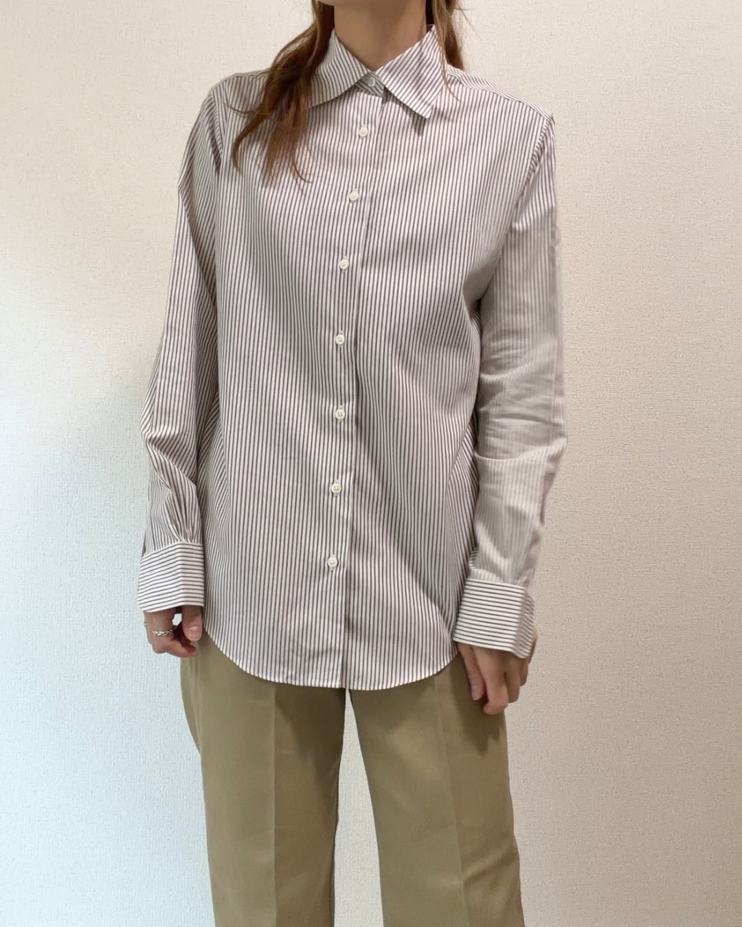 白地にブラウンのストライプ織り柄が入った生地が使われており、柔らかい雰囲気のある色合いです。