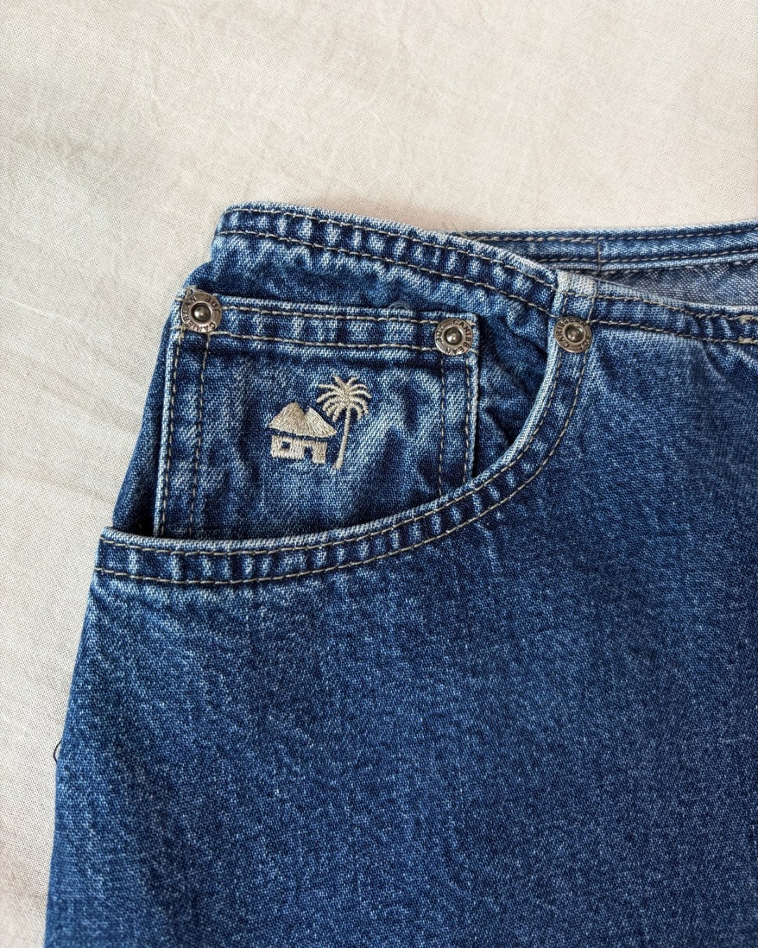 ヤシの木と小屋のイラストを刺繍したワンポイントマークが特徴的です。