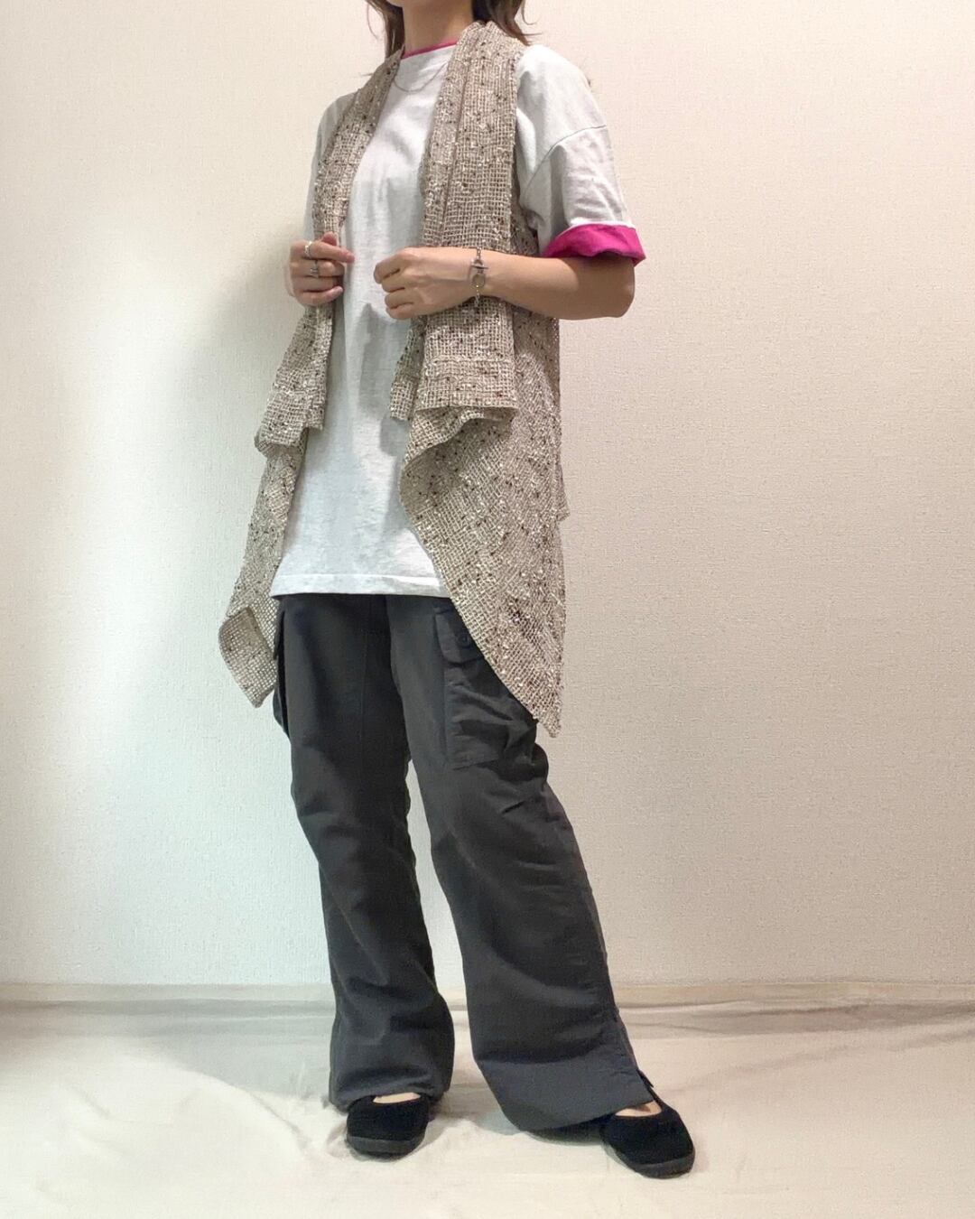 明るいピンクカラーが、コーディネートのポイントにもなります。