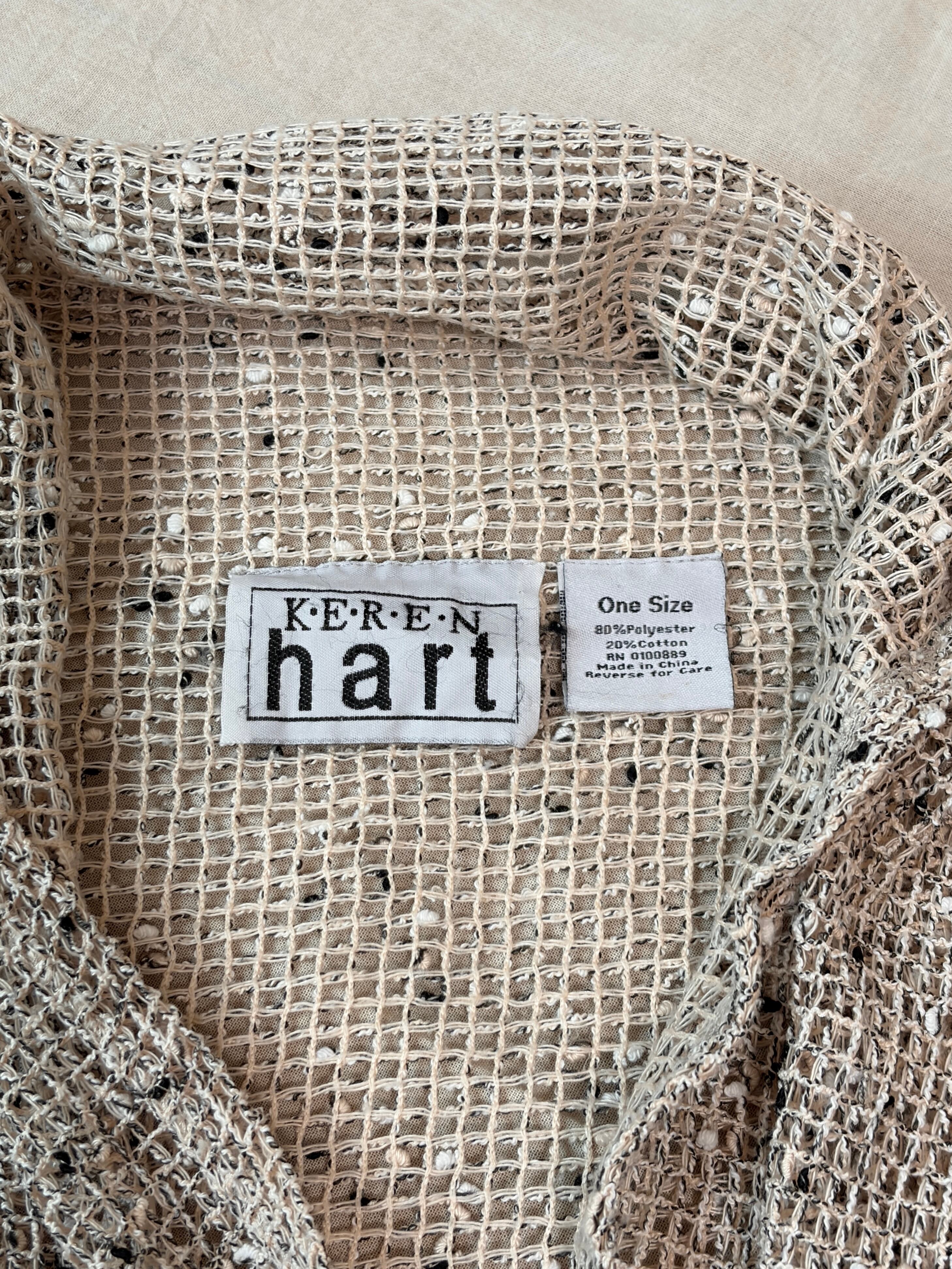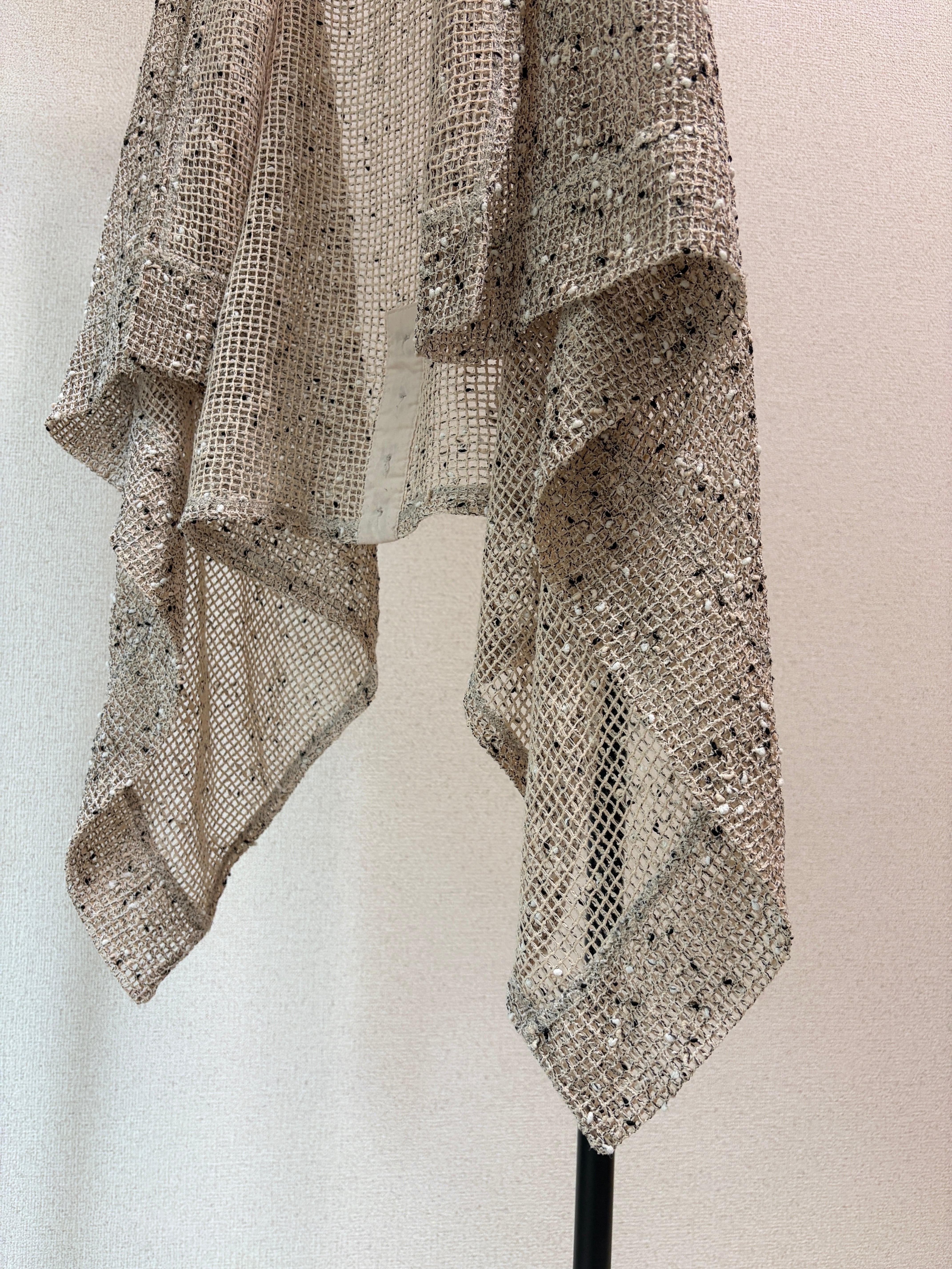 格子状のメッシュ生地の中に白や黒のネップが混ざった、珍しい素材感です。