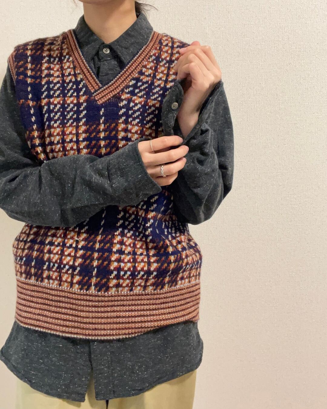 シンプルに一枚でに着こなしたり、前を開けて羽織りとしても使いやすい、とても着回しが効くアイテムです。